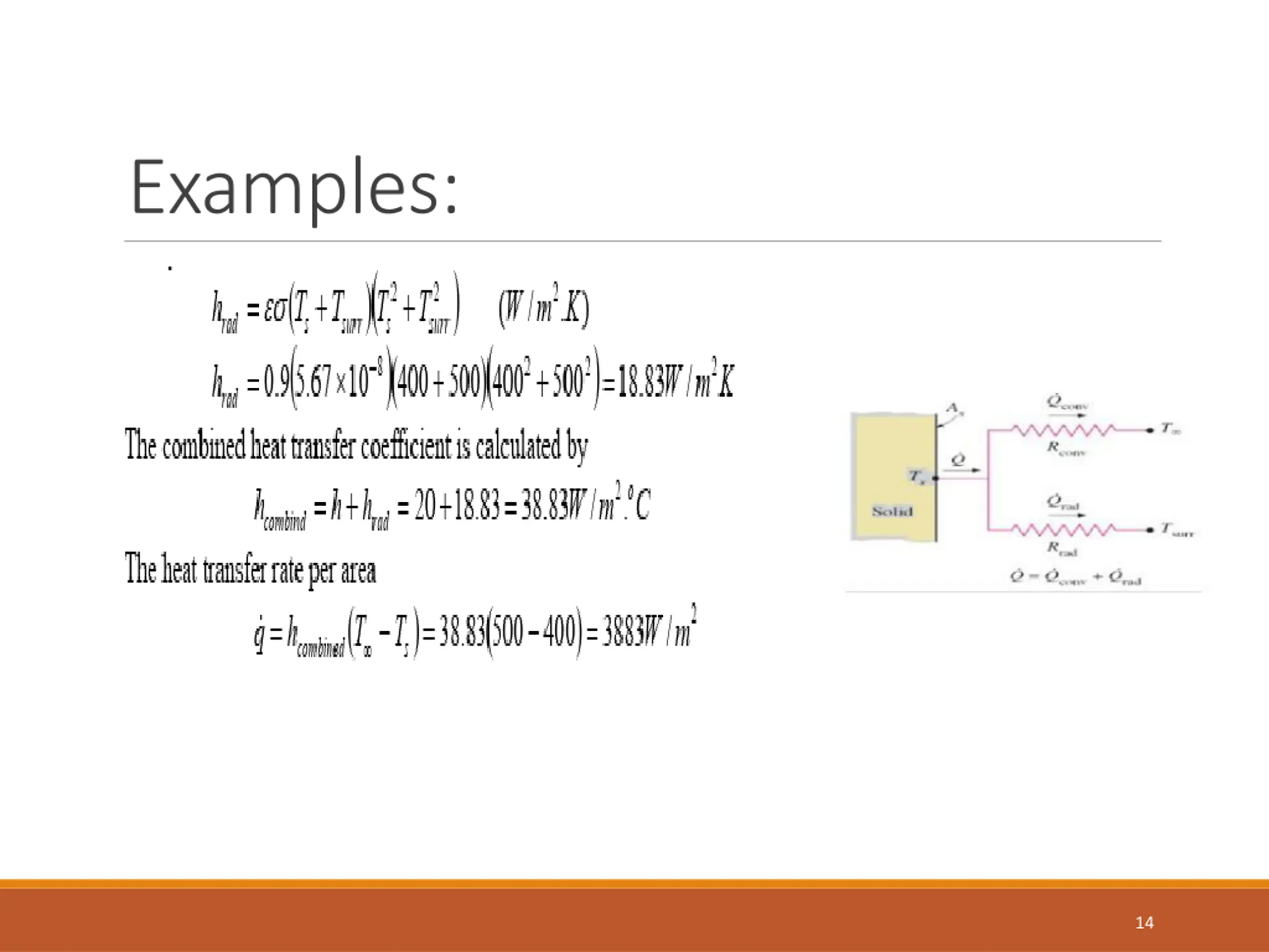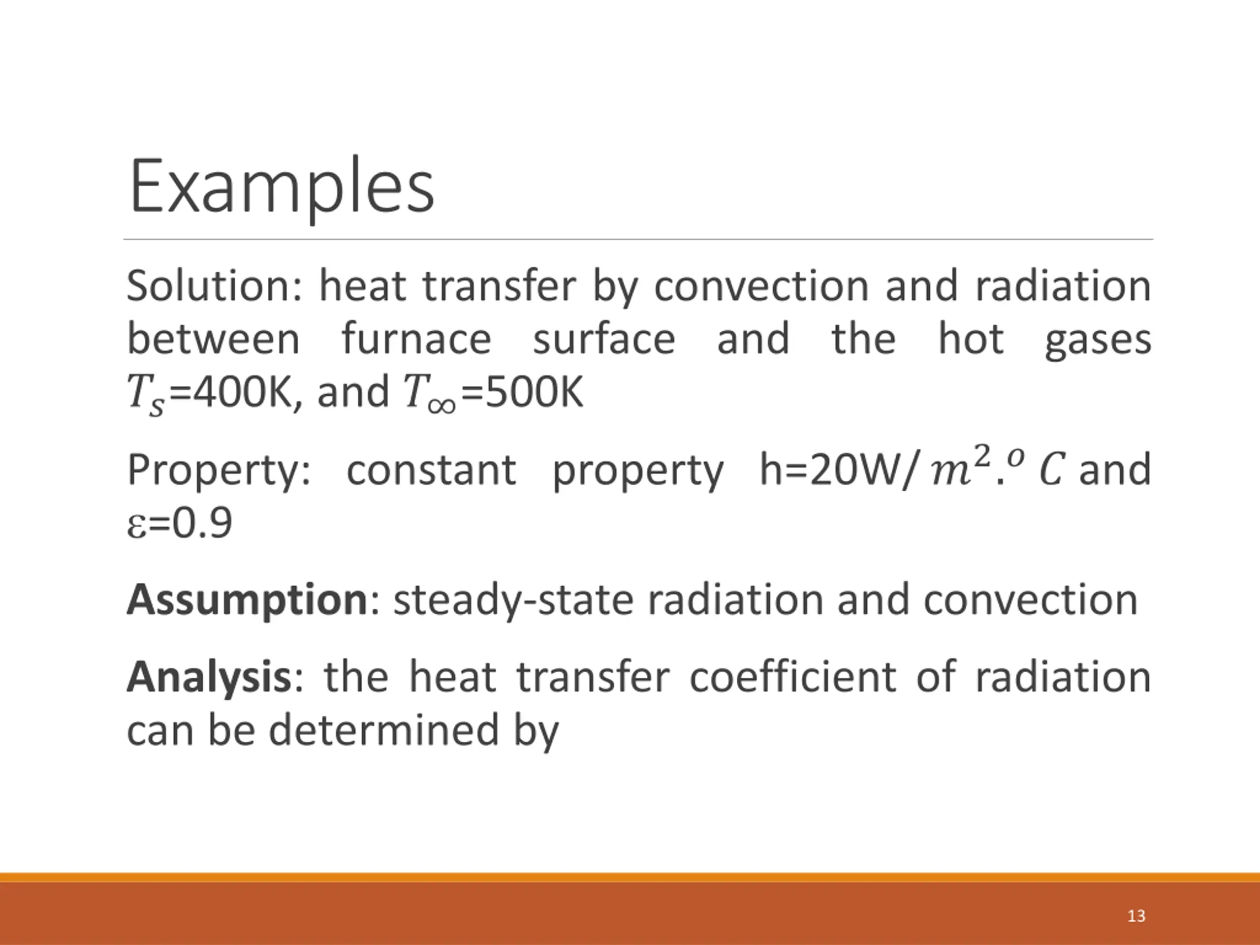 Examples Example 2. The temperature of gases in a furnace is (500K). The temperature of inside surface of the furnace is (400K). The heat transfer between the gases and the surface of the furnace occurs by convection and radiation. The convection coefficient is (20W/?2.??). The furnace surface emissivity is (0.9). Find the combined heat transfer coefficient and the heat transfer rate per unit area. 12