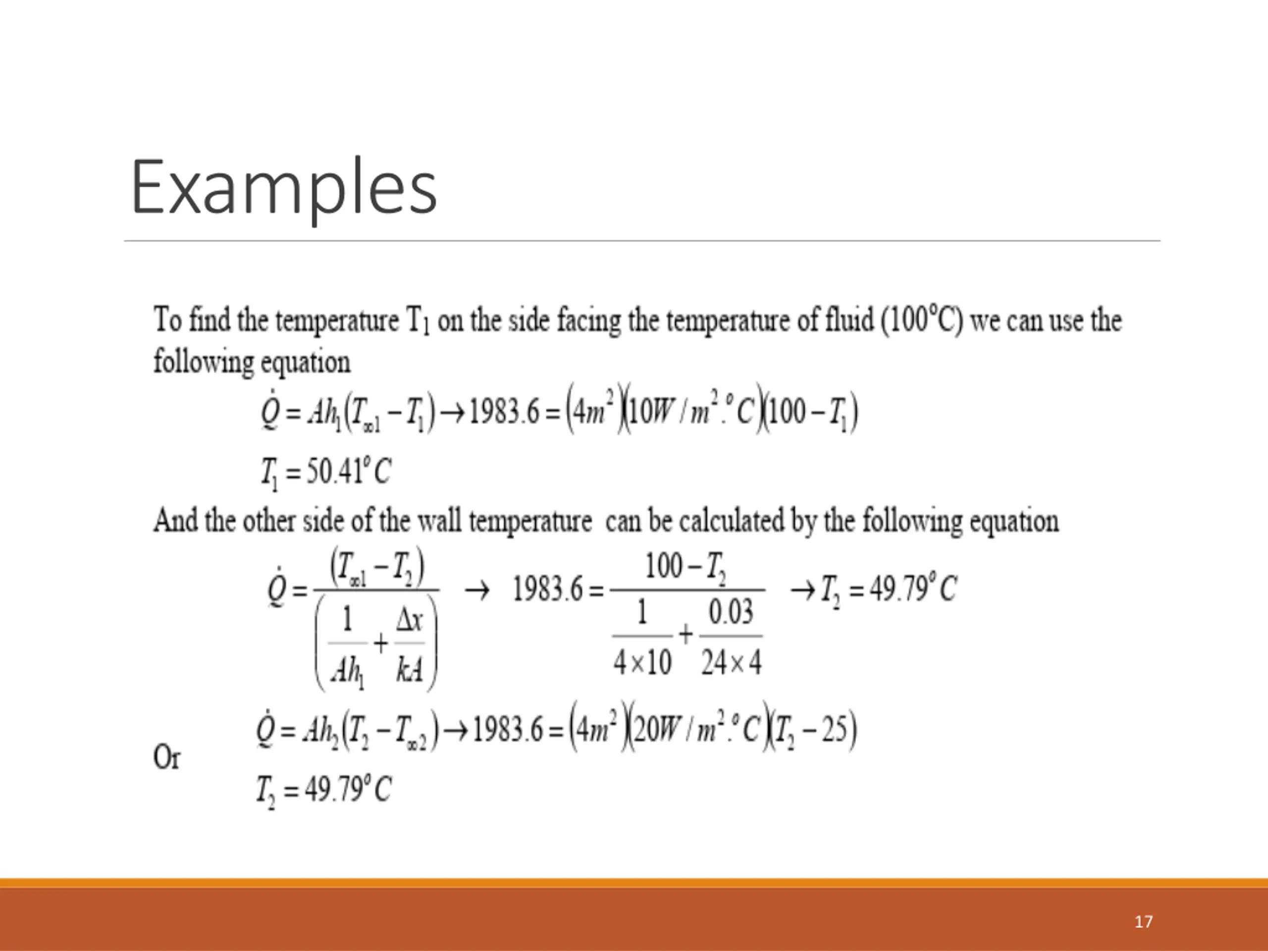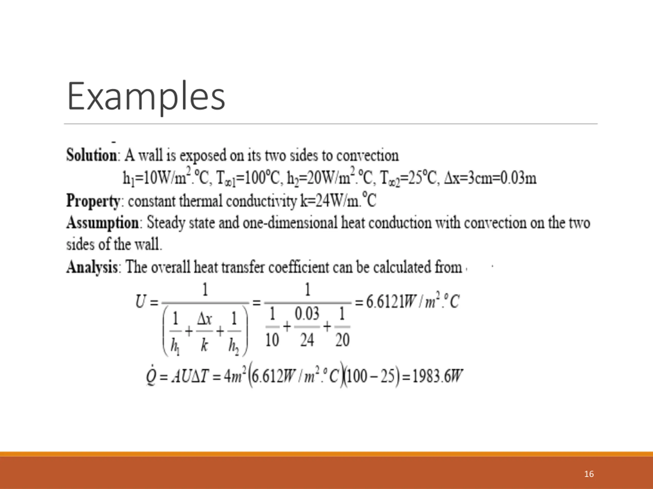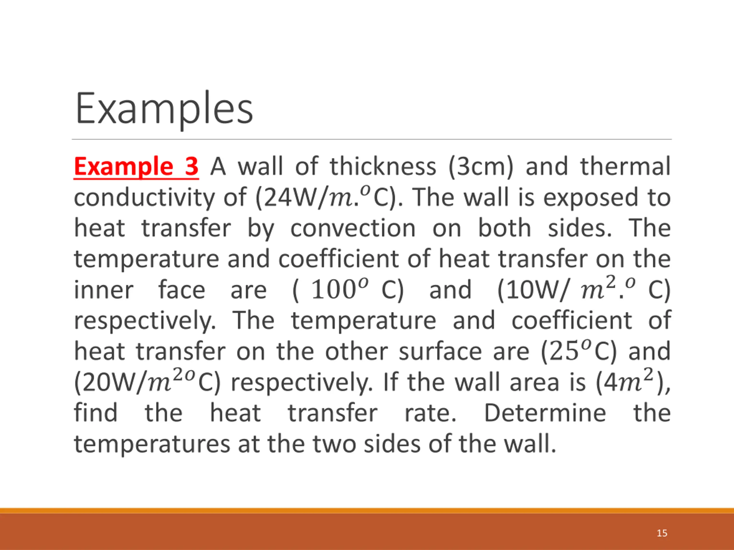 Examples Example 3 A wall of thickness (3cm) and thermal conductivity of (24W/?.?C). The wall is exposed to heat transfer by convection on both sides. The temperature and coefficient of heat transfer on the inner face are ( 100?C) and (10W/ ?2.?C) respectively. The temperature and coefficient of heat transfer on the other surface are (25?C) and (20W/?2?C) respectively. If the wall area is (4?2), find the heat transfer rate. Determine the temperatures at the two sides of the wall. 15