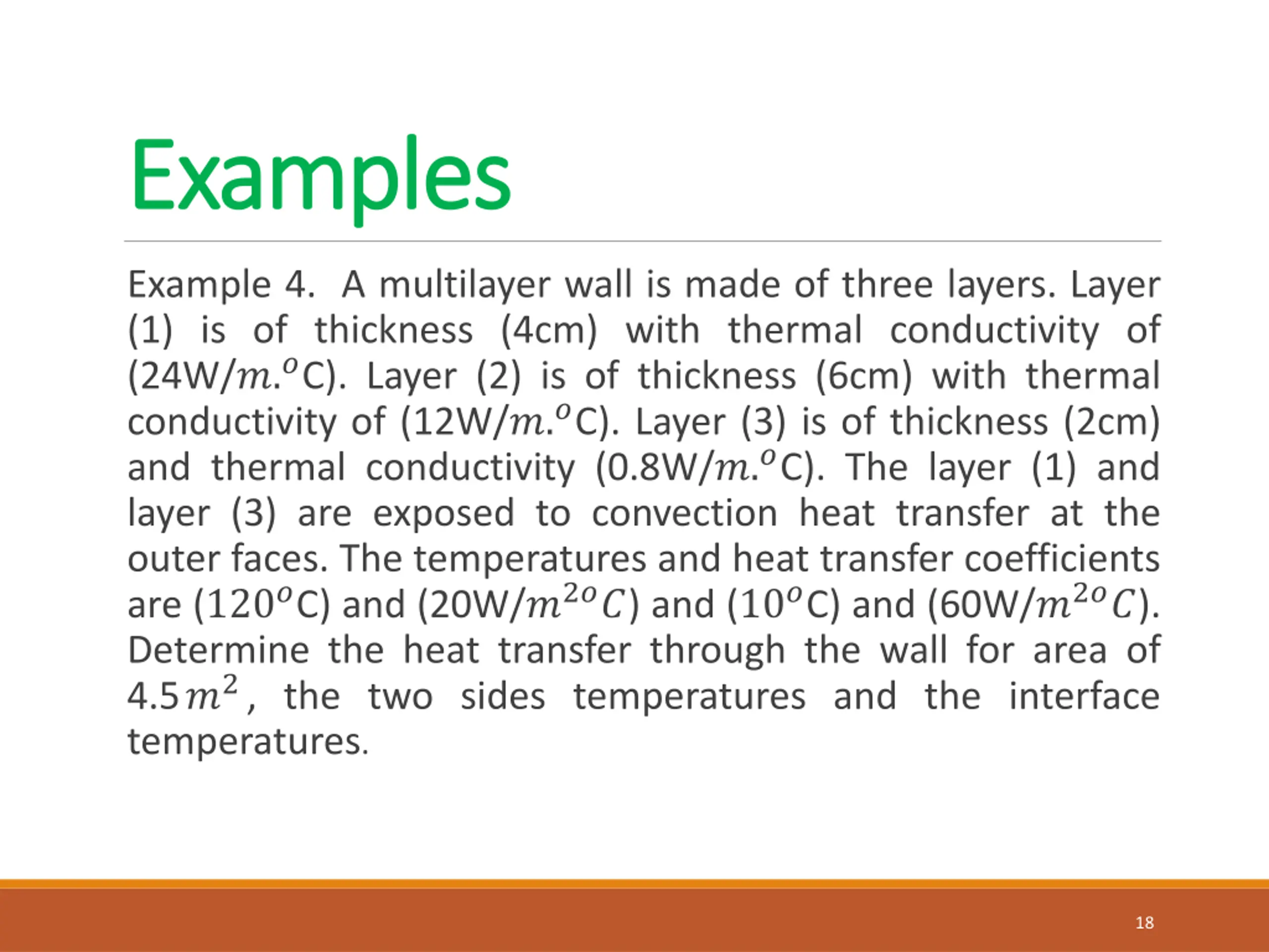 Examples Examples Example 4. A multilayer wall is made of three layers. Layer (1) is of thickness (4cm) with thermal conductivity of (24W/?.?C). Layer (2) is of thickness (6cm) with thermal conductivity of (12W/?.?C). Layer (3) is of thickness (2cm) and thermal conductivity (0.8W/?.?C). The layer (1) and layer (3) are exposed to convection heat transfer at the outer faces. The temperatures and heat transfer coefficients are (120?C) and (20W/?2??) and (10?C) and (60W/?2??). Determine the heat transfer through the wall for area of 4.5?2, the two sides temperatures and the interface temperatures. 18