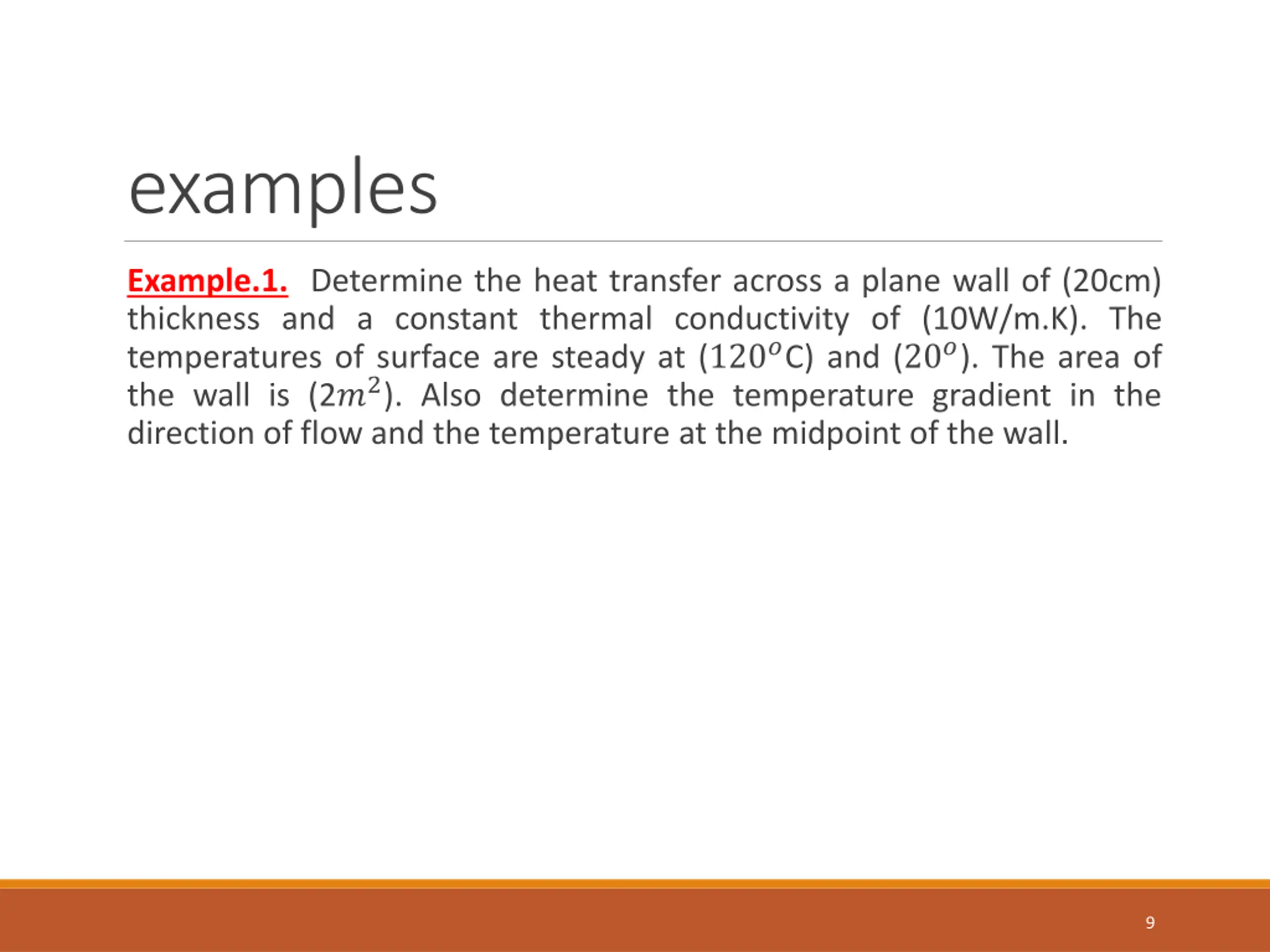 examples Example.1. Determine the heat transfer across a plane wall of (20cm) thickness and a constant thermal conductivity of (10W/m.K). The temperatures of surface are steady at (120?C) and (20?). The area of the wall is (2?2). Also determine the temperature gradient in the direction of flow and the temperature at the midpoint of the wall. 9