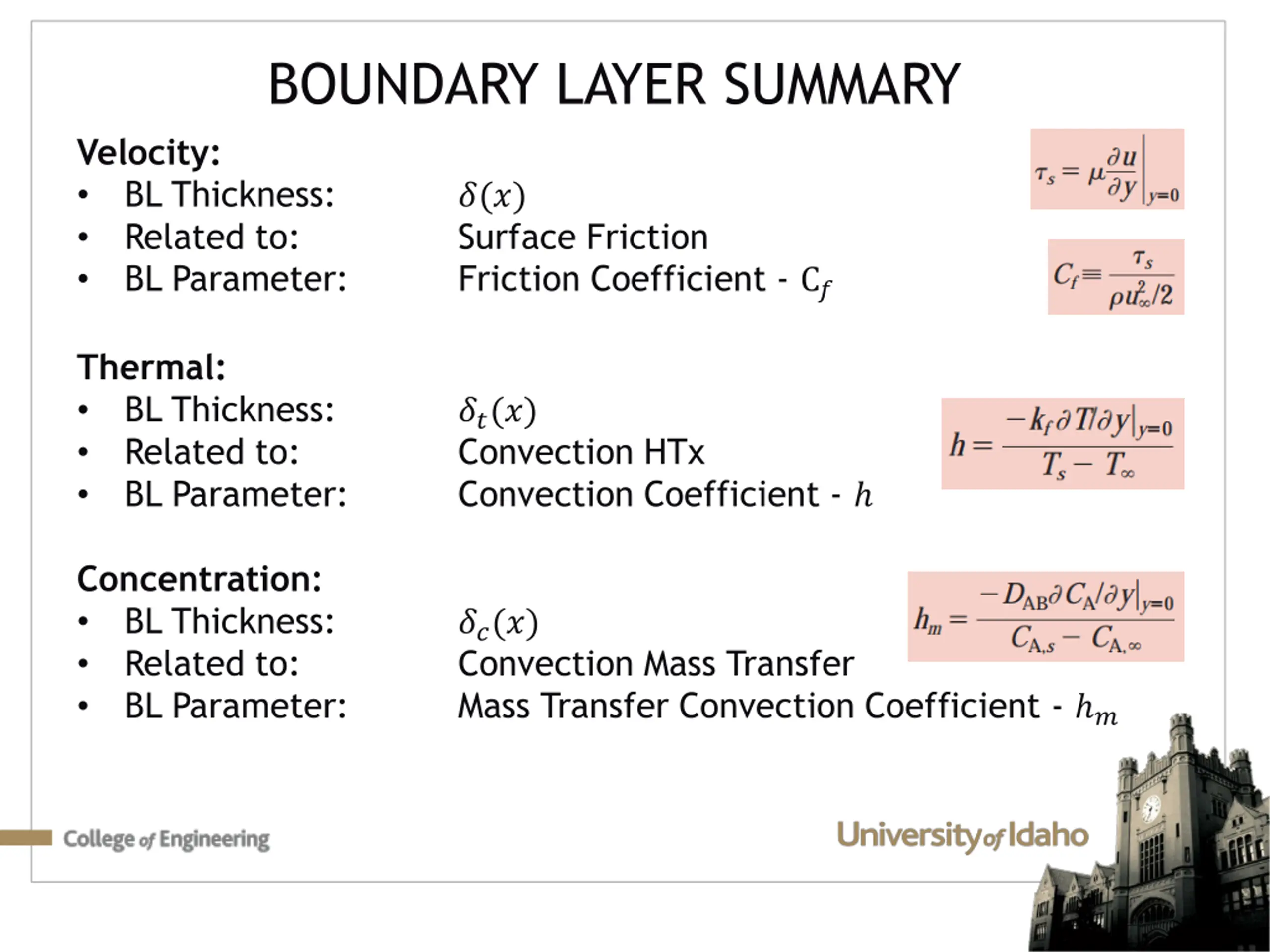 BOUNDARY LAYER SUMMARY Velocity: BL Thickness: Related to: BL Parameter: ?(?) Surface Friction Friction Coefficient - C? Thermal: BL Thickness: Related to: BL Parameter: ??(?) Convection HTx Convection Coefficient - Concentration: BL Thickness: Related to: BL Parameter: ??(?) Convection Mass Transfer Mass Transfer Convection Coefficient - ?
