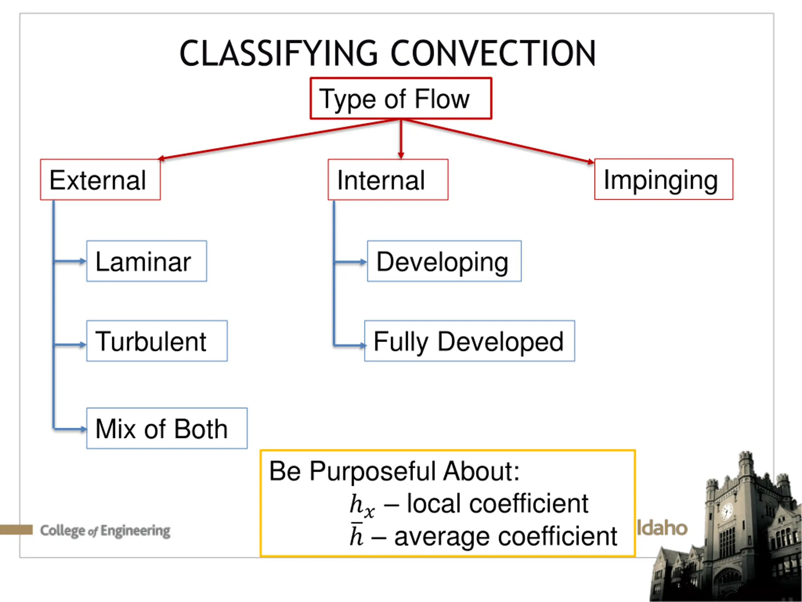 CLASSIFYING CONVECTION Type of Flow Impinging External Internal Laminar Developing Turbulent Fully Developed Mix of Both Be Purposeful About: ? local coefficient average coefficient