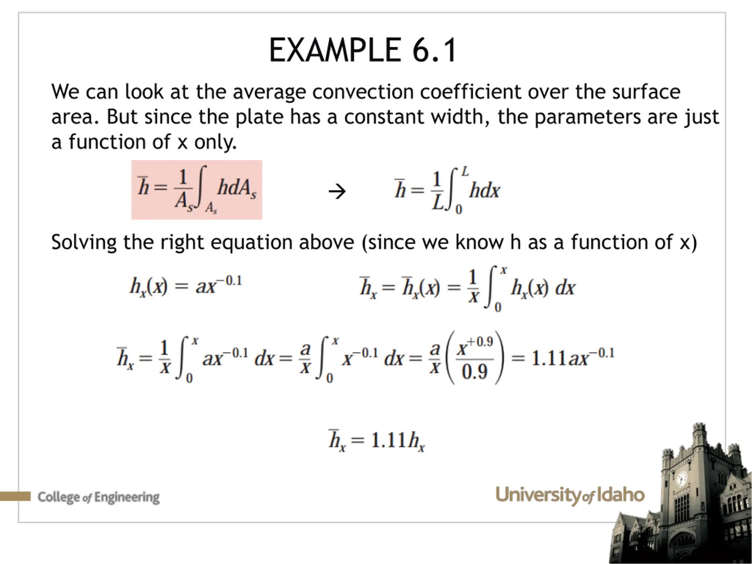 EXAMPLE 6.1 We can look at the average convection coefficient over the surface area. But since the plate has a constant width, the parameters are just a function of x only. Solving the right equation above (since we know h as a function of x)