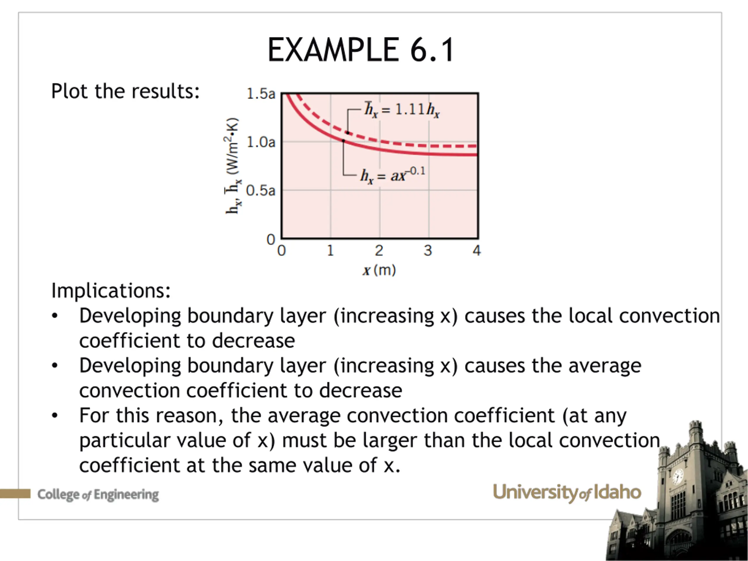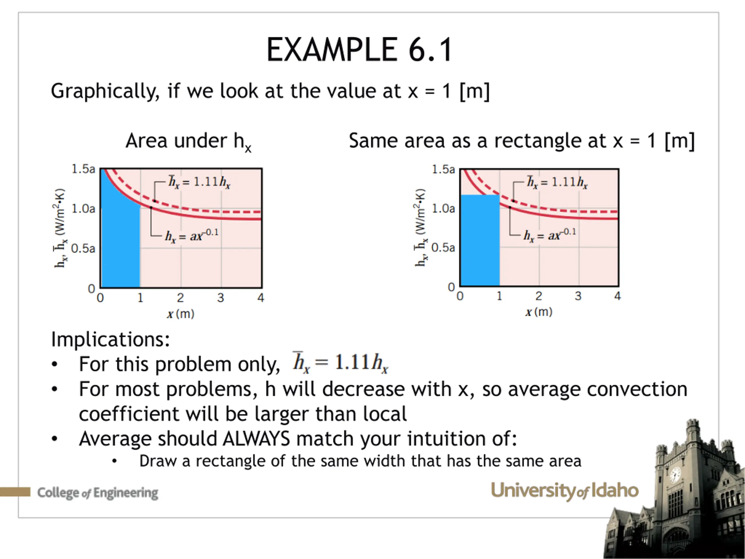 EXAMPLE 6.1 Graphically, if we look at the value at x = 1 [m] Area under hx Same area as a rectangle at x = 1 [m] Implications: For this problem only, For most problems, h will decrease with x, so average convection coefficient will be larger than local Average should ALWAYS match your intuition of: Draw a rectangle of the same width that has the same area