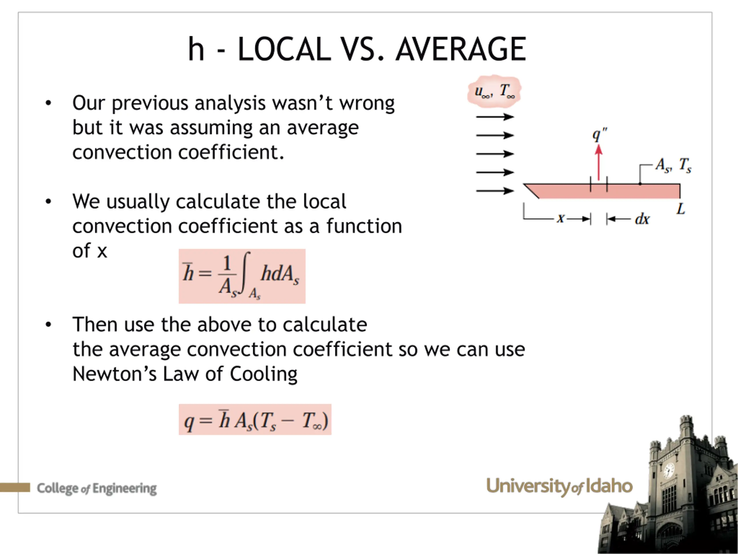 h - LOCAL VS. AVERAGE Our previous analysis wasn t wrong but it was assuming an average convection coefficient. We usually calculate the local convection coefficient as a function of x Then use the above to calculate the average convection coefficient so we can use Newton s Law of Cooling