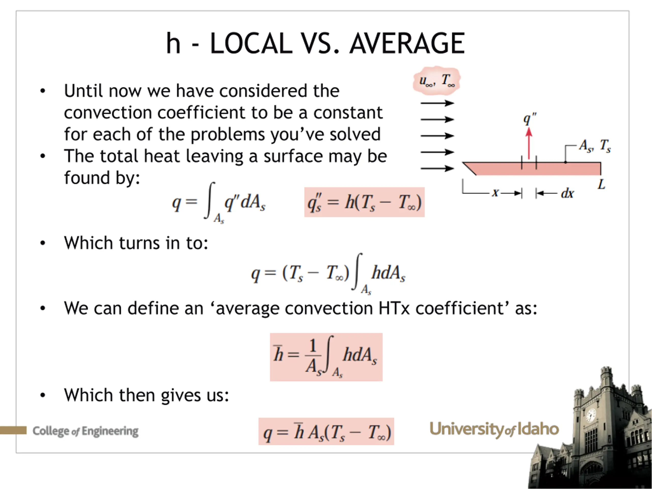 h - LOCAL VS. AVERAGE Until now we have considered the convection coefficient to be a constant for each of the problems you ve solved The total heat leaving a surface may be found by: Which turns in to: We can define an average convection HTx coefficient as: Which then gives us: