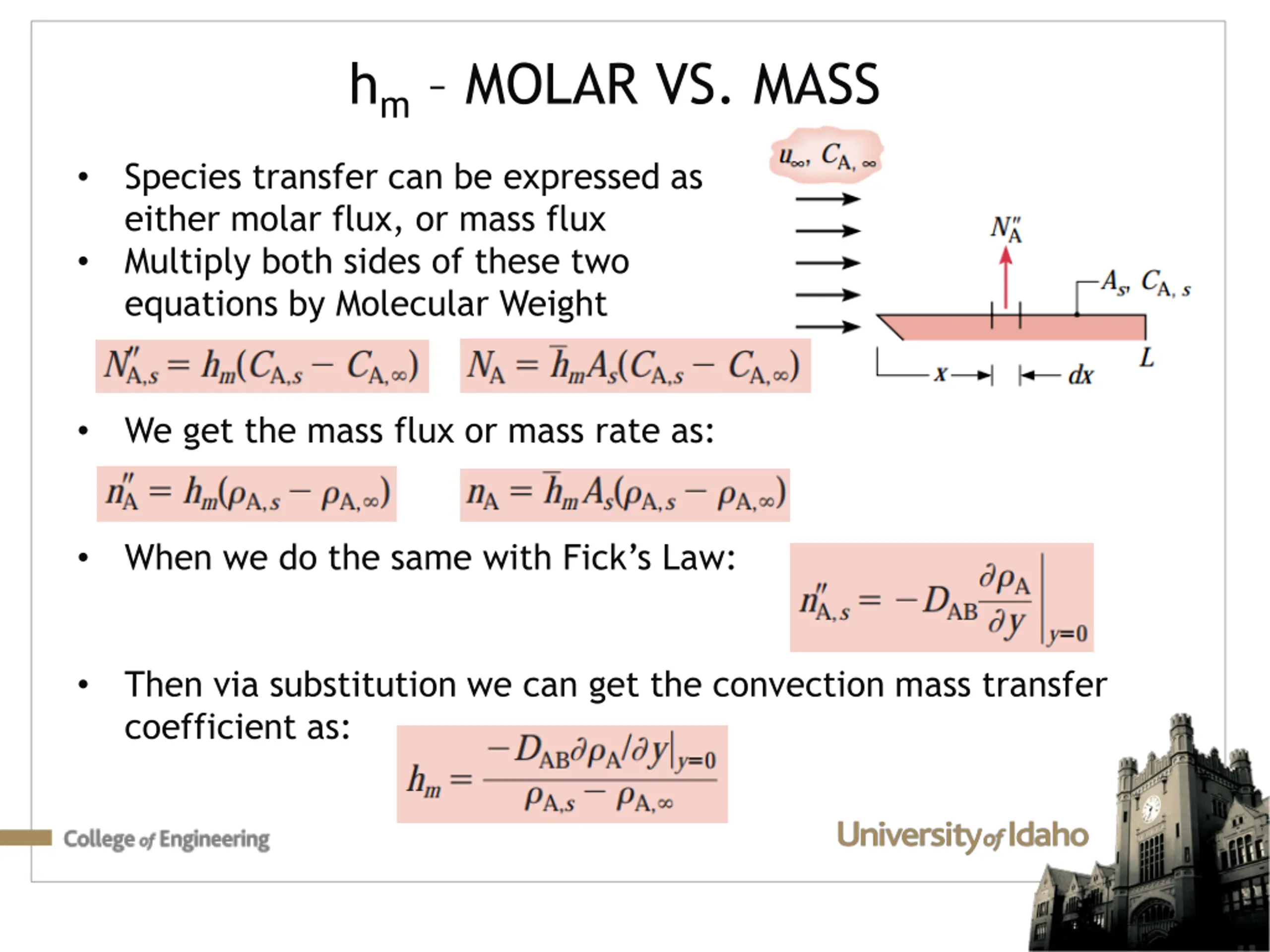 hm MOLAR VS. MASS Species transfer can be expressed as either molar flux, or mass flux Multiply both sides of these two equations by Molecular Weight We get the mass flux or mass rate as: When we do the same with Fick s Law: Then via substitution we can get the convection mass transfer coefficient as: