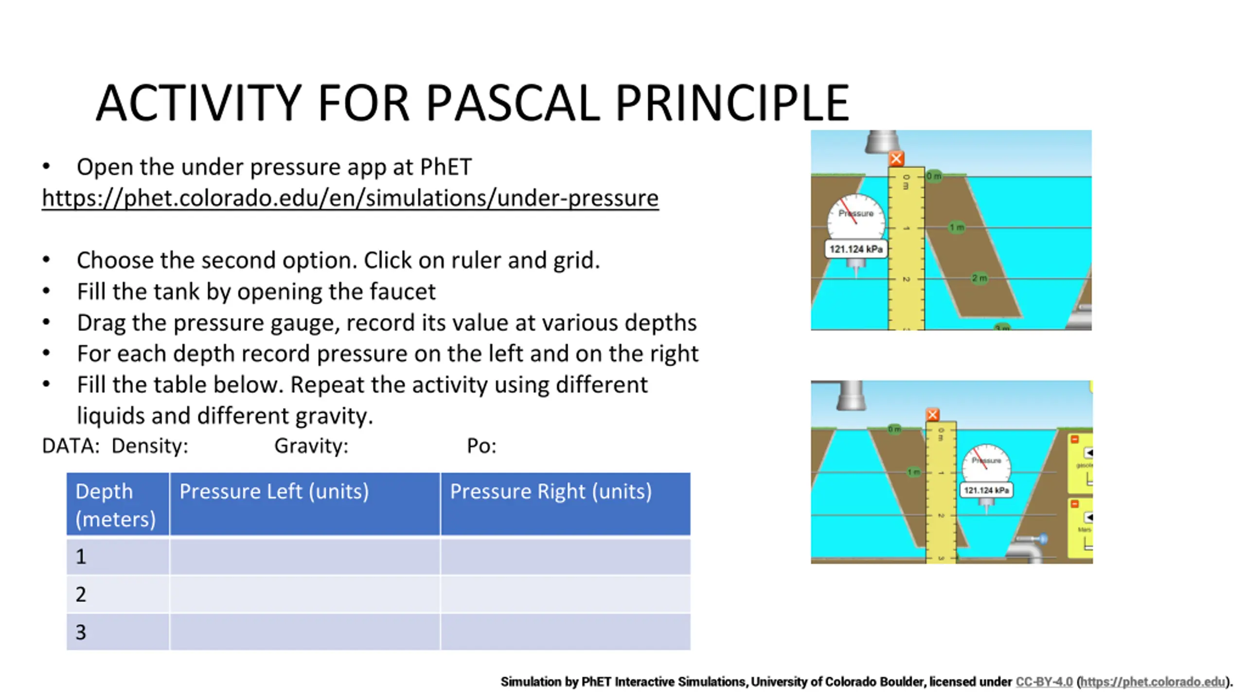 ACTIVITY FOR PASCAL PRINCIPLE https://phet.colorado.edu/en/simulations/under-pressure Open the under pressure app at PhET Choose the second option. Click on ruler and grid. Fill the tank by opening the faucet Drag the pressure gauge, record its value at various depths For each depth record pressure on the left and on the right Fill the table below. Repeat the activity using different liquids and different gravity. DATA: Density: Gravity: Po: Depth (meters) Pressure Left (units) Pressure Right (units) 1 2 3 Simulation by PhET Interactive Simulations, University of Colorado Boulder, licensed under CC-BY-4.0 (https://phet.colorado.edu).