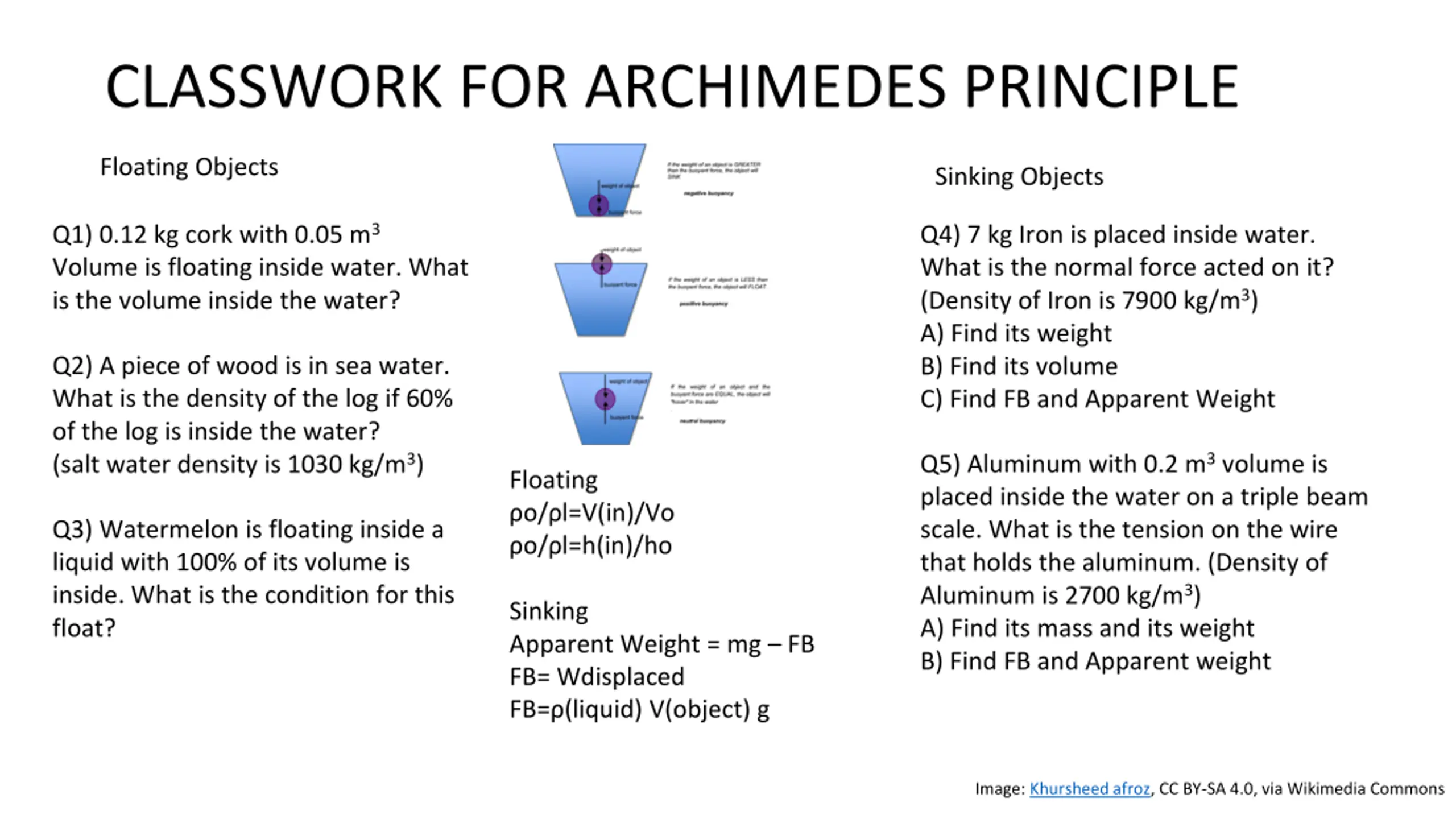 CLASSWORK FOR ARCHIMEDES PRINCIPLE Floating Objects Sinking Objects Q1) 0.12 kg cork with 0.05 m3 Volume is floating inside water. What is the volume inside the water? Q4) 7 kg Iron is placed inside water. What is the normal force acted on it? (Density of Iron is 7900 kg/m3) A) Find its weight B) Find its volume C) Find FB and Apparent Weight Q2) A piece of wood is in sea water. What is the density of the log if 60% of the log is inside the water? (salt water density is 1030 kg/m3) Q5) Aluminum with 0.2 m3volume is placed inside the water on a triple beam scale. What is the tension on the wire that holds the aluminum. (Density of Aluminum is 2700 kg/m3) A) Find its mass and its weight B) Find FB and Apparent weight Floating o/ l=V(in)/Vo o/ l=h(in)/ho Q3) Watermelon is floating inside a liquid with 100% of its volume is inside. What is the condition for this float? Sinking Apparent Weight = mg FB FB= Wdisplaced FB= (liquid) V(object) g Image: Khursheed afroz, CC BY-SA 4.0, via Wikimedia Commons