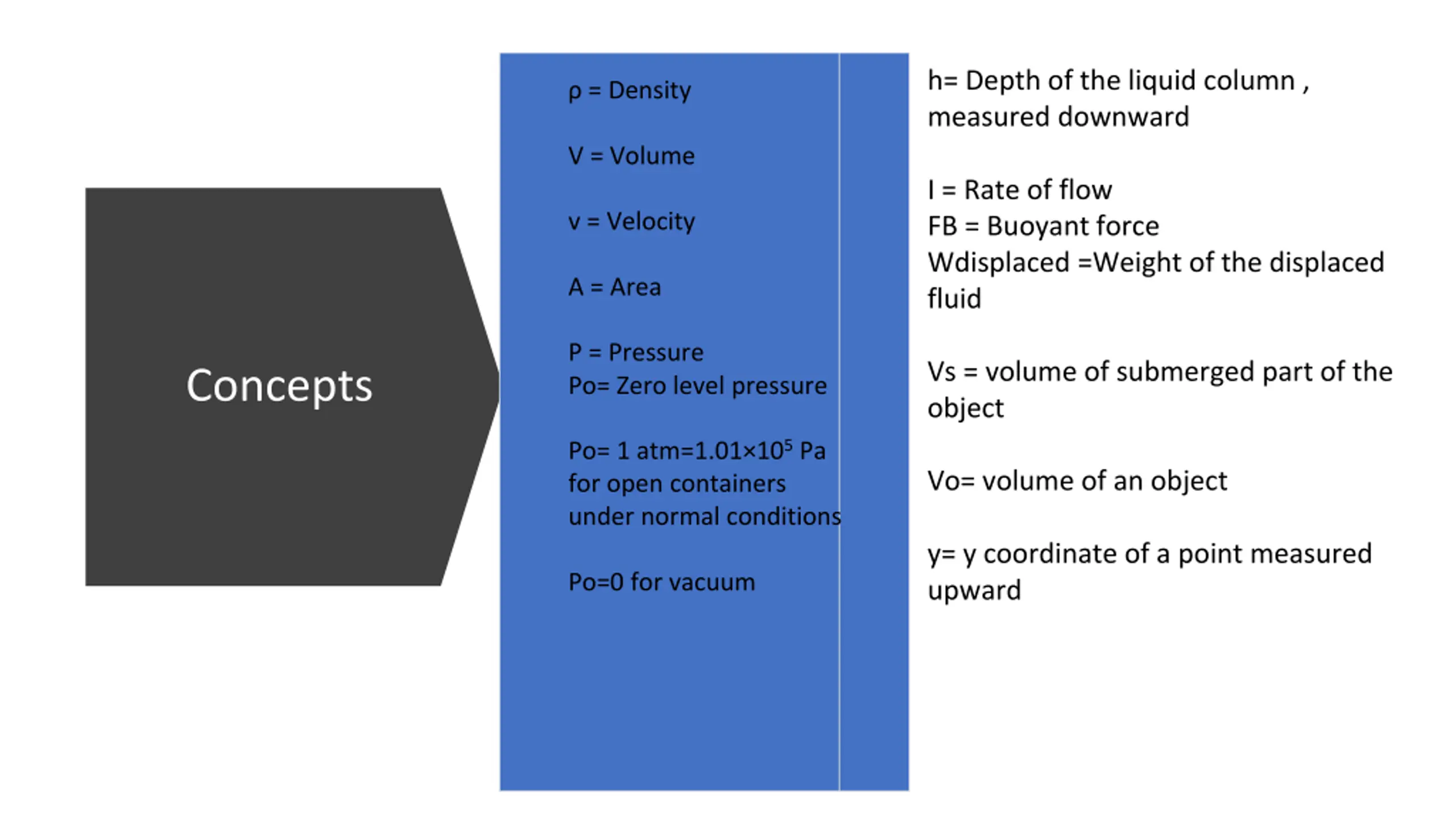 h= Depth of the liquid column , measured downward = Density V = Volume I = Rate of flow FB = Buoyant force Wdisplaced =Weight of the displaced fluid v = Velocity A = Area P = Pressure Po= Zero level pressure Vs = volume of submerged part of the object Concepts Po= 1 atm=1.01 105Pa for open containers under normal conditions Vo= volume of an object y= y coordinate of a point measured upward Po=0 for vacuum