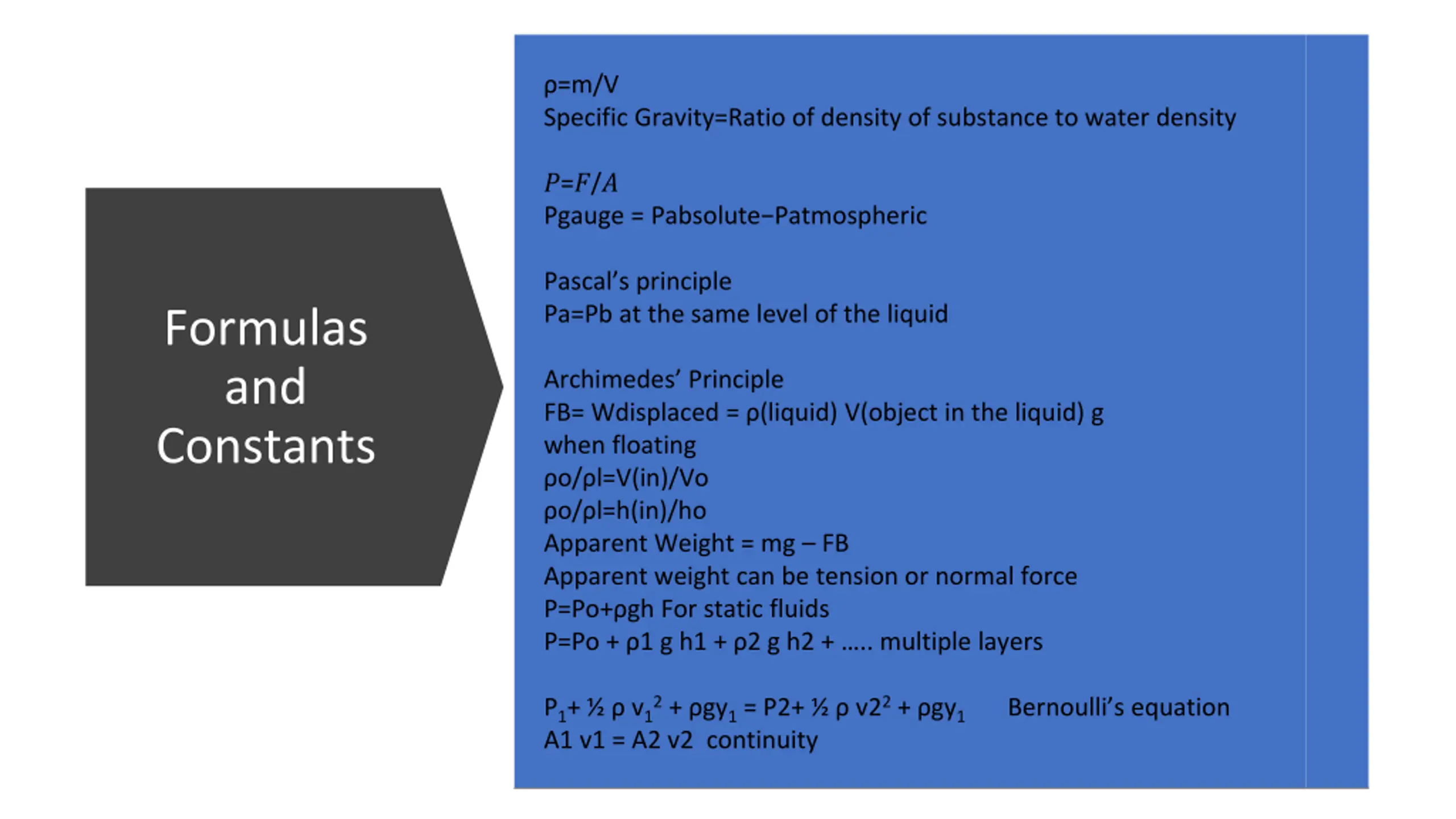 =m/V Specific Gravity=Ratio of density of substance to water density ?=?/? Pgauge = Pabsolute Patmospheric Pascal s principle Pa=Pb at the same level of the liquid Formulas and Constants Archimedes Principle FB= Wdisplaced = (liquid) V(object in the liquid) g when floating o/ l=V(in)/Vo o/ l=h(in)/ho Apparent Weight = mg FB Apparent weight can be tension or normal force P=Po+ gh For static fluids P=Po + 1 g h1 + 2 g h2 + .. multiple layers P1+ v12+ gy1= P2+ v22+ gy1 A1 v1 = A2 v2 continuity Bernoulli s equation