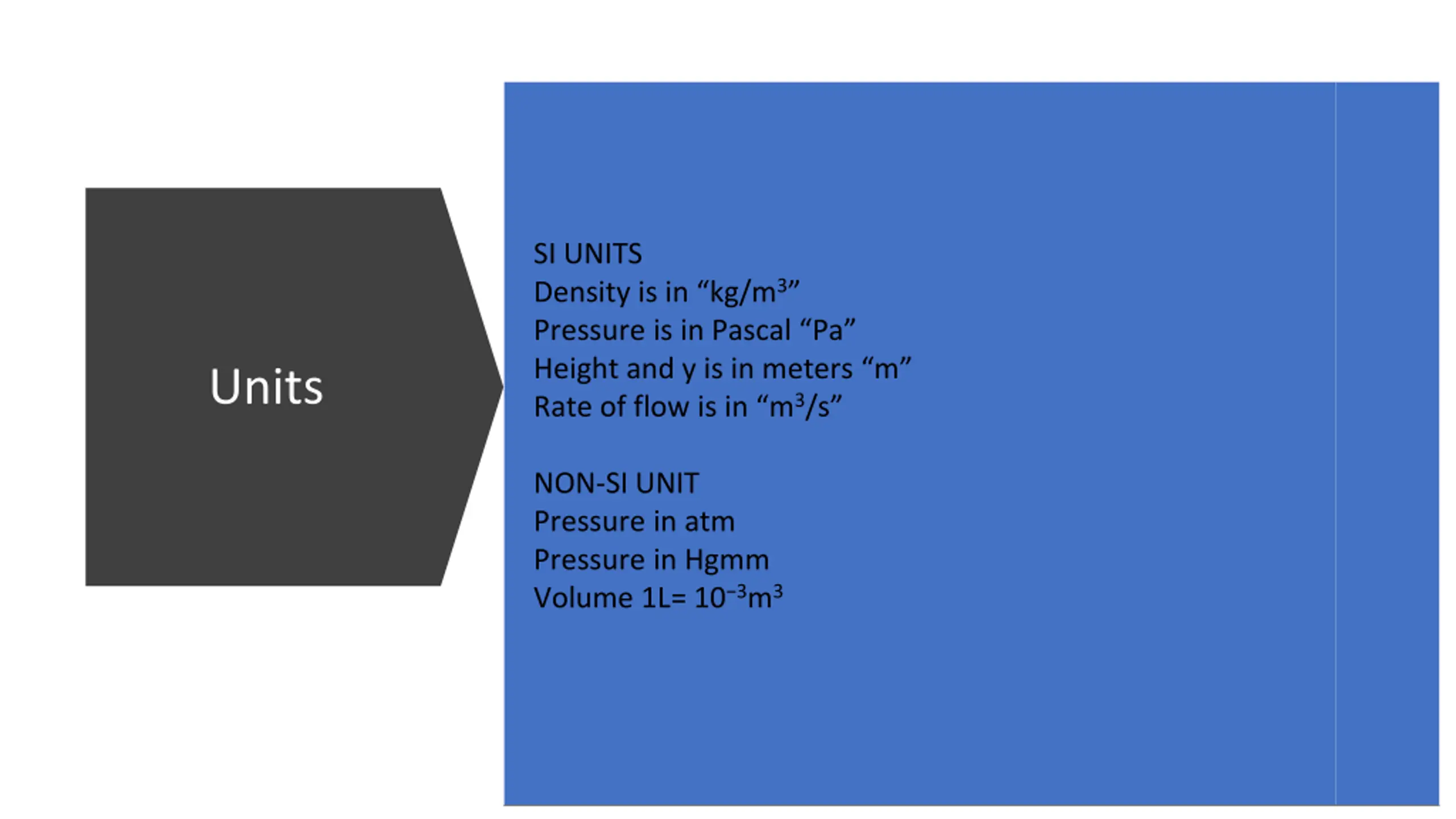 SI UNITS Density is in kg/m3 Pressure is in Pascal Pa Height and y is in meters m Rate of flow is in m3/s Units NON-SI UNIT Pressure in atm Pressure in Hgmm Volume 1L= 10 3m3