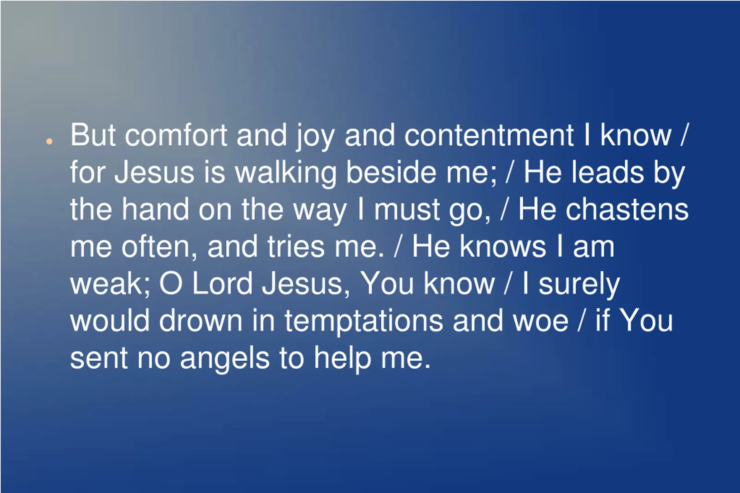 But comfort and joy and contentment I know / for Jesus is walking beside me; / He leads by the hand on the way I must go, / He chastens me often, and tries me. / He knows I am weak; O Lord Jesus, You know / I surely would drown in temptations and woe / if You sent no angels to help me.