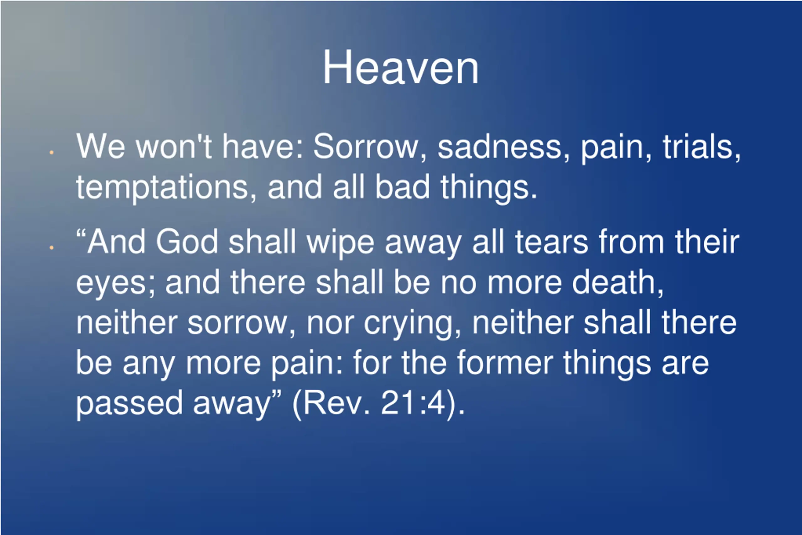 Heaven We won't have: Sorrow, sadness, pain, trials, temptations, and all bad things. And God shall wipe away all tears from their eyes; and there shall be no more death, neither sorrow, nor crying, neither shall there be any more pain: for the former things are passed away (Rev. 21:4).