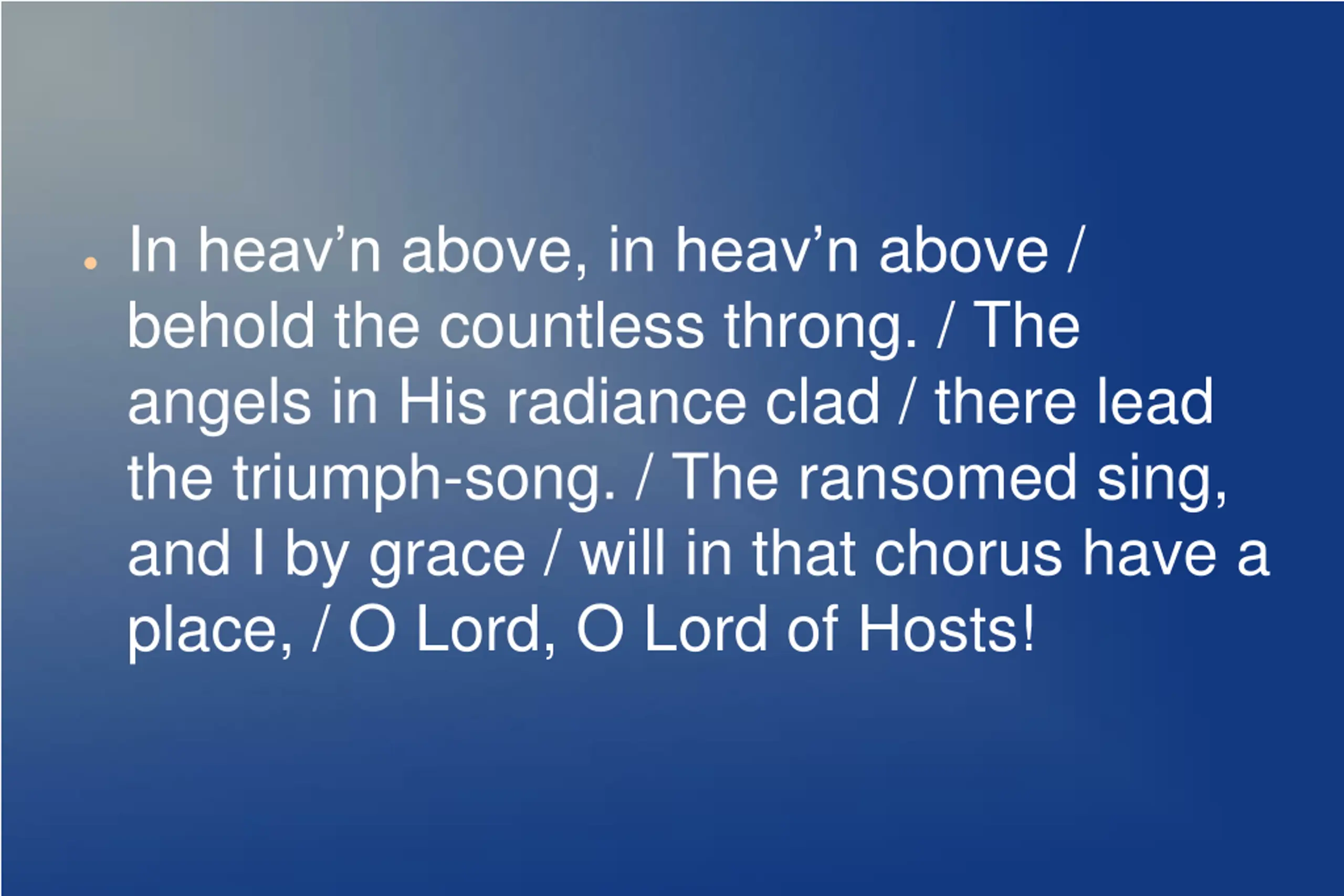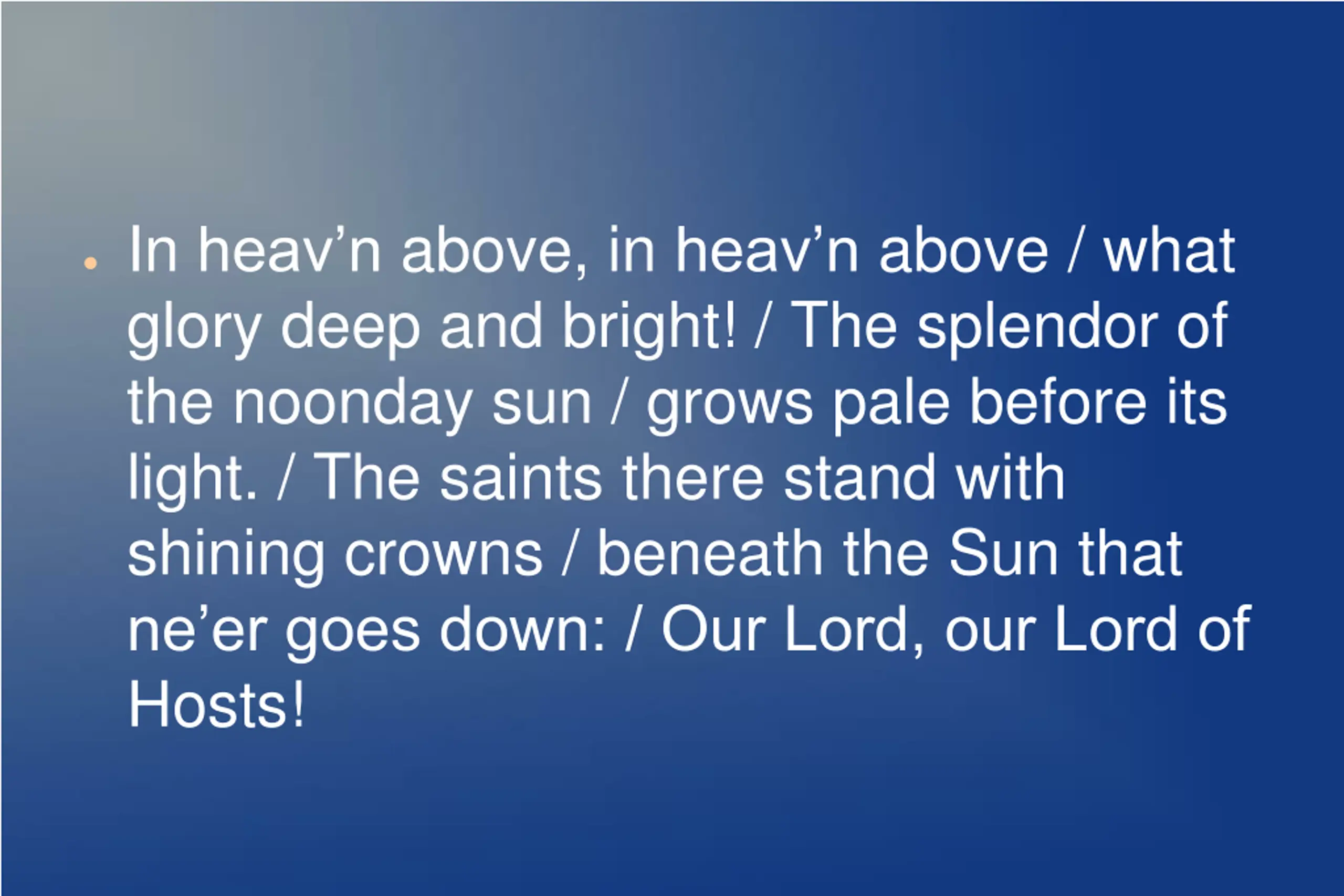 In heavn above, in heavn above / what glory deep and bright! / The splendor of the noonday sun / grows pale before its light. / The saints there stand with shining crowns / beneath the Sun that ne er goes down: / Our Lord, our Lord of Hosts!