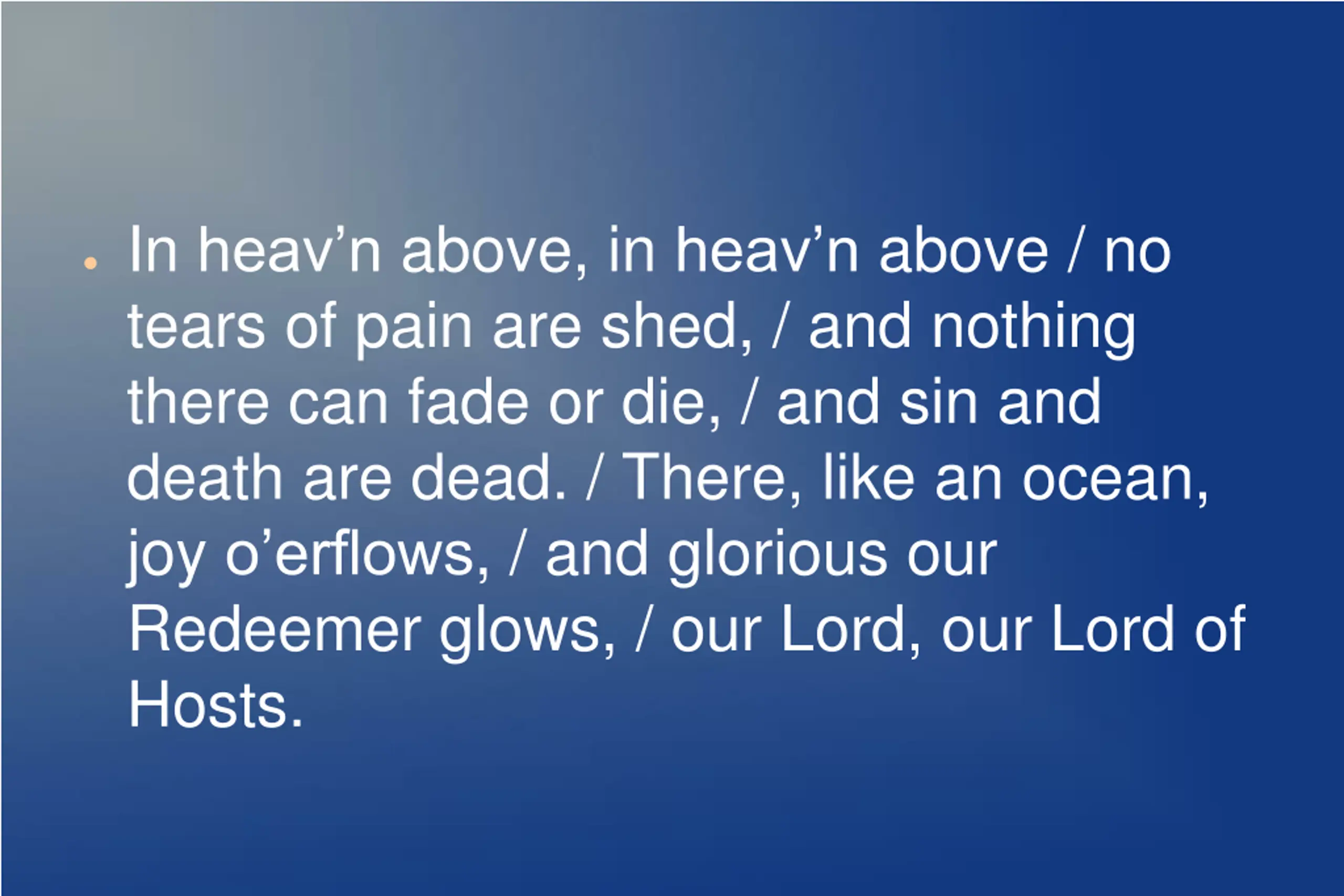 In heavn above, in heavn above / no tears of pain are shed, / and nothing there can fade or die, / and sin and death are dead. / There, like an ocean, joy o erflows, / and glorious our Redeemer glows, / our Lord, our Lord of Hosts.