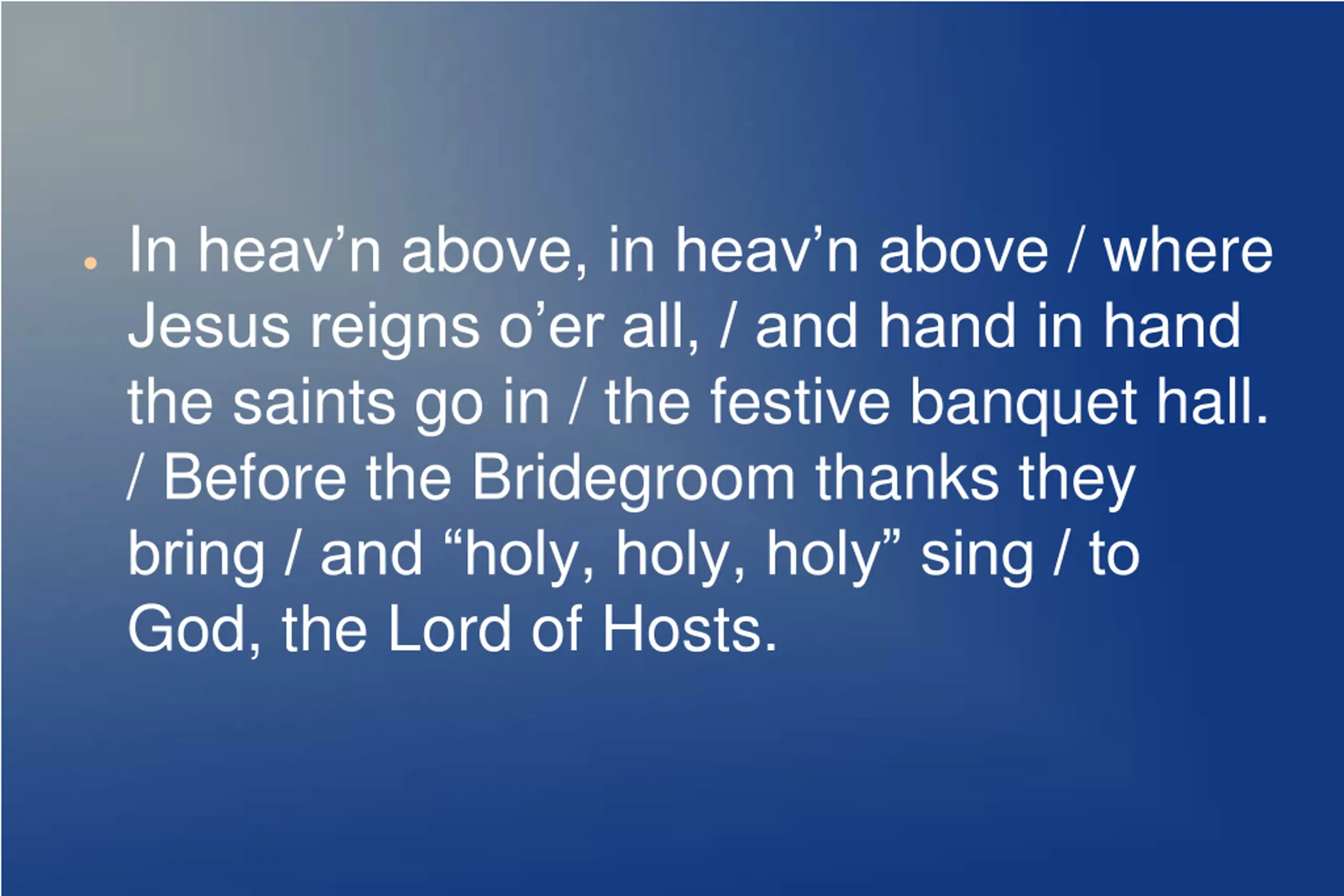 In heavn above, in heavn above / where Jesus reigns o er all, / and hand in hand the saints go in / the festive banquet hall. / Before the Bridegroom thanks they bring / and holy, holy, holy sing / to God, the Lord of Hosts.