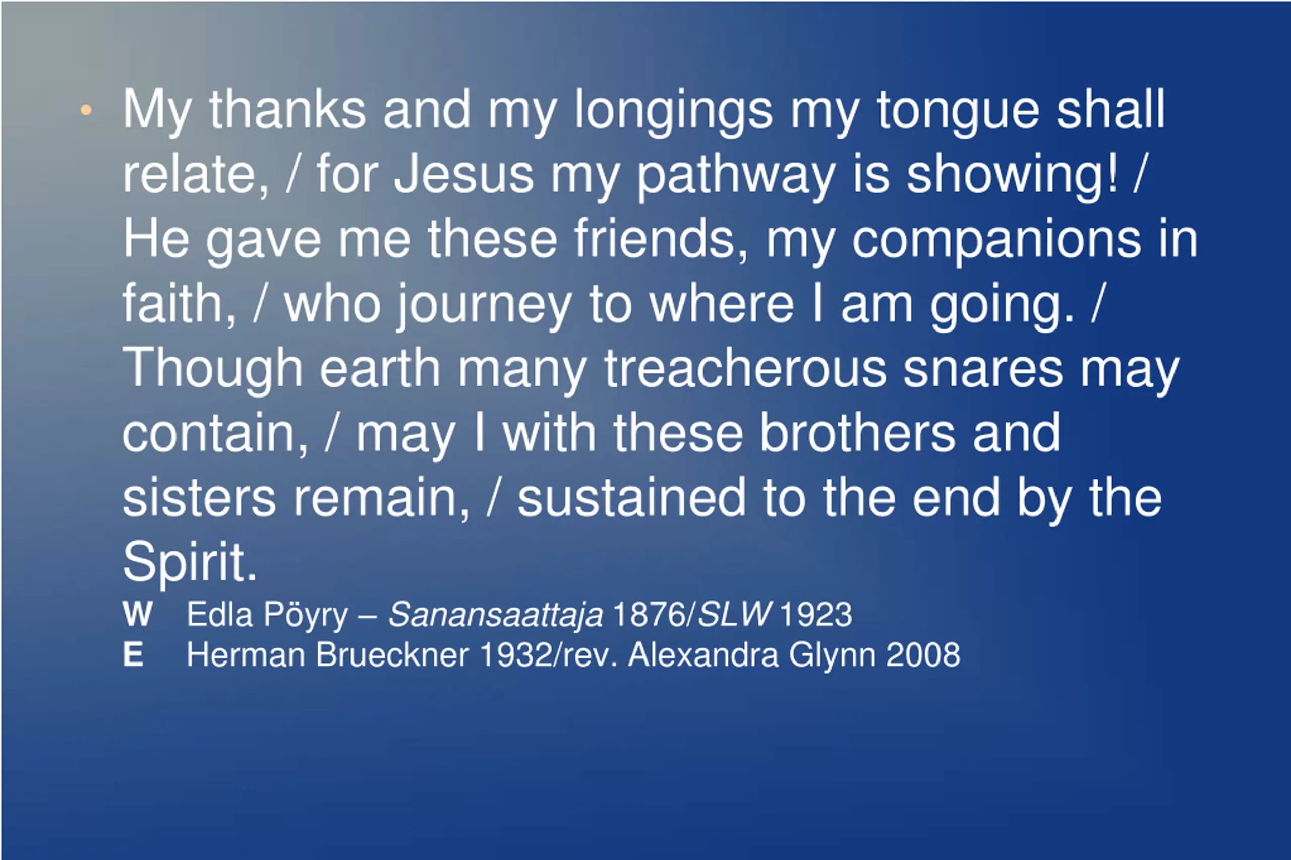 My thanks and my longings my tongue shall relate, / for Jesus my pathway is showing! / He gave me these friends, my companions in faith, / who journey to where I am going. / Though earth many treacherous snares may contain, / may I with these brothers and sisters remain, / sustained to the end by the Spirit. W Edla P yry Sanansaattaja 1876/SLW 1923 E Herman Brueckner 1932/rev. Alexandra Glynn 2008