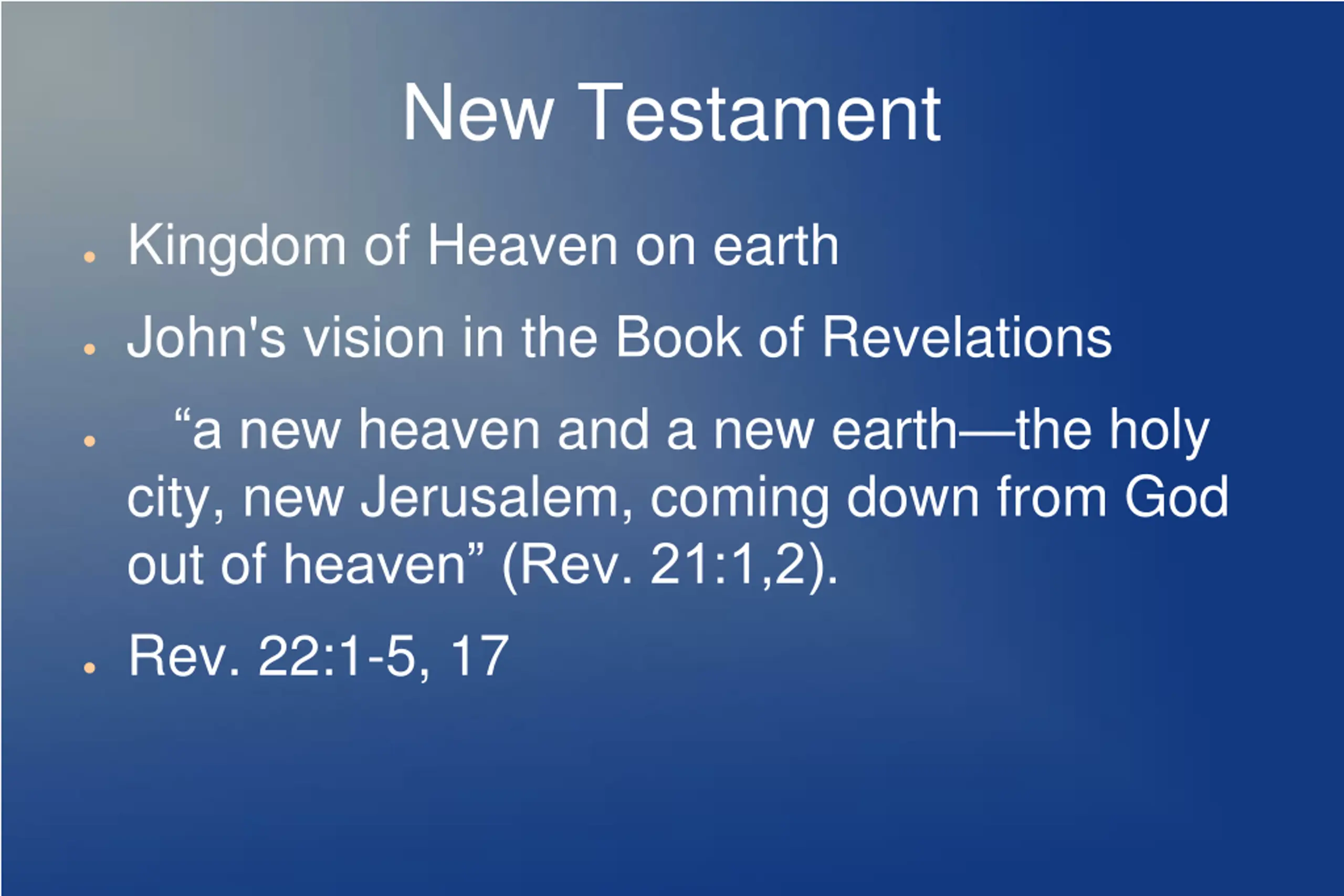 New Testament Kingdom of Heaven on earth John's vision in the Book of Revelations a new heaven and a new earth the holy city, new Jerusalem, coming down from God out of heaven (Rev. 21:1,2). Rev. 22:1-5, 17