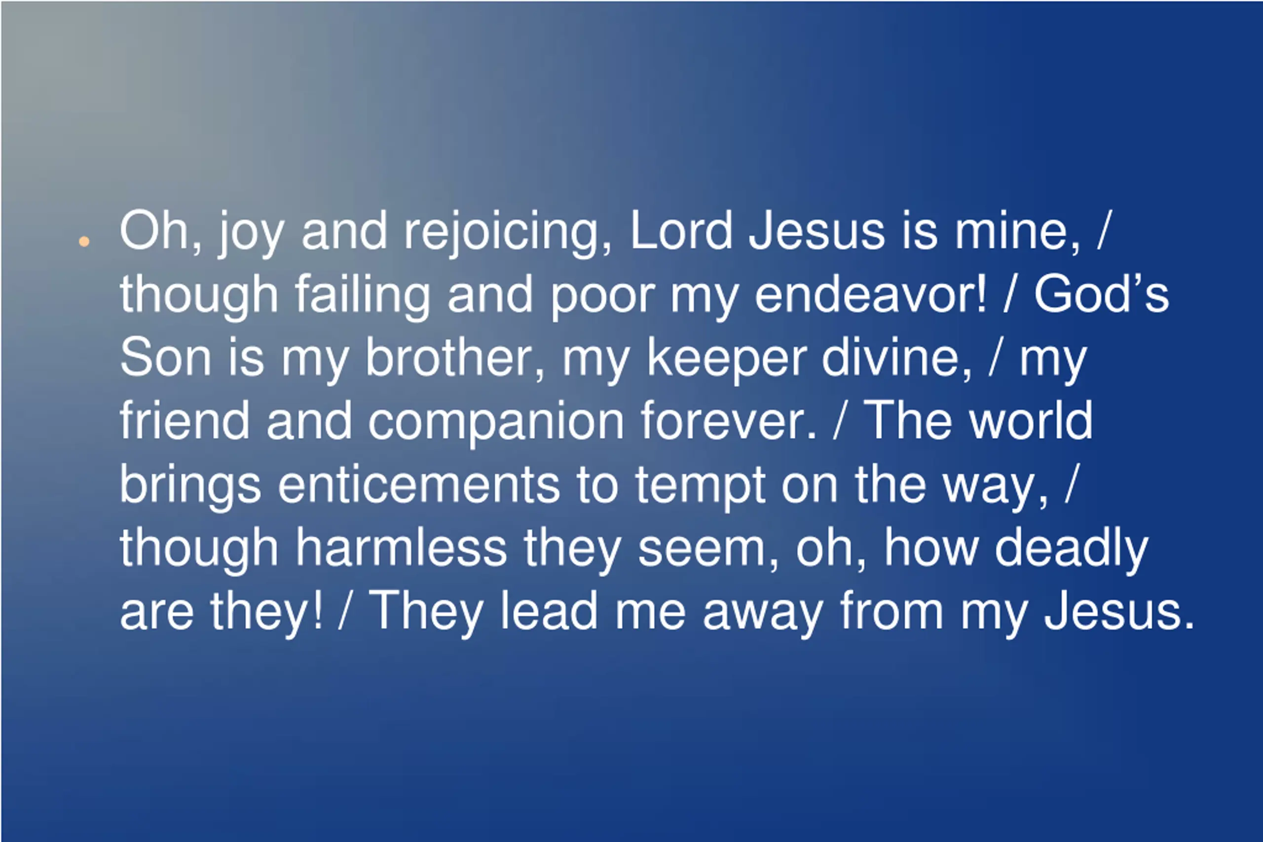 Oh, joy and rejoicing, Lord Jesus is mine, / though failing and poor my endeavor! / God s Son is my brother, my keeper divine, / my friend and companion forever. / The world brings enticements to tempt on the way, / though harmless they seem, oh, how deadly are they! / They lead me away from my Jesus.