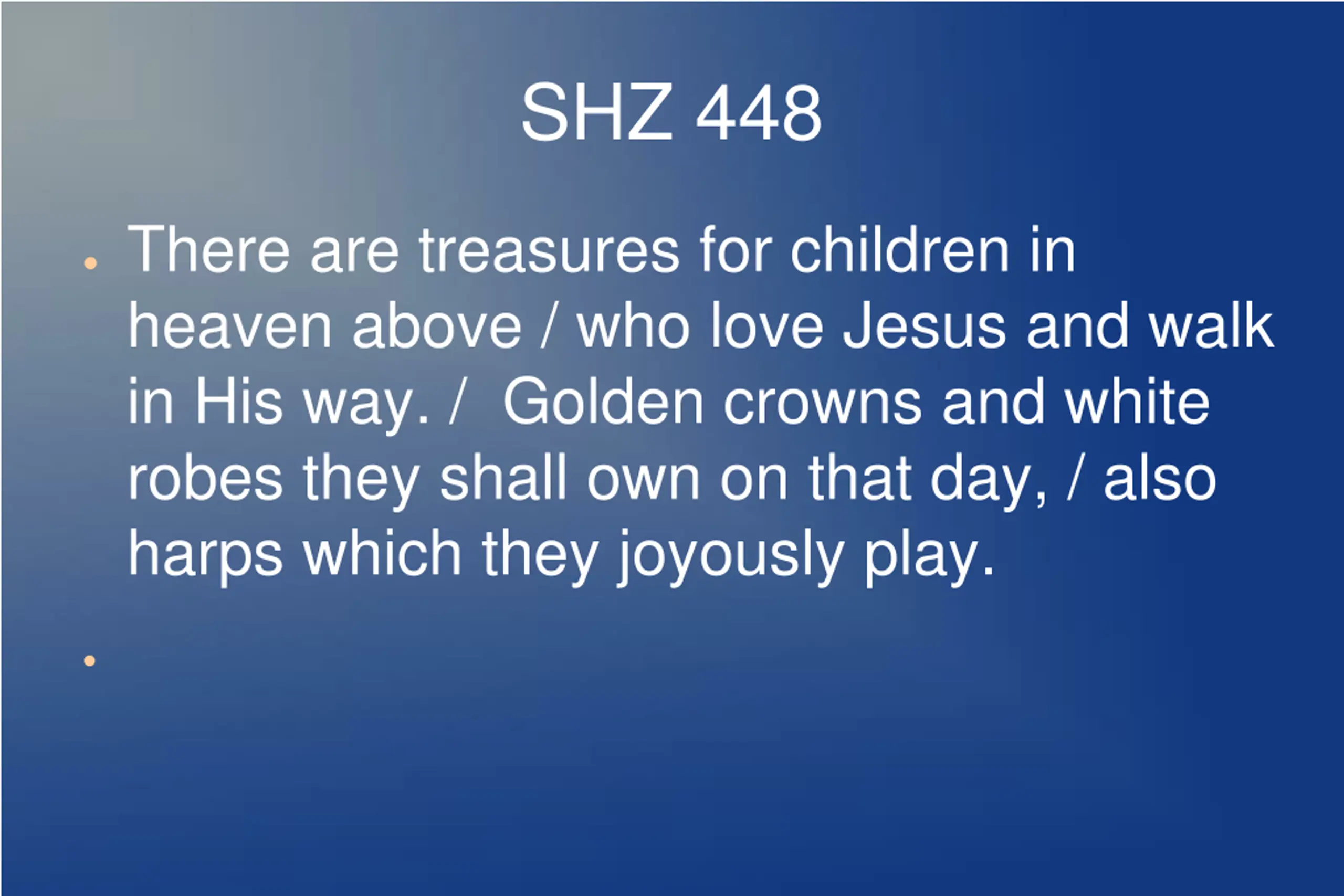 SHZ 448 There are treasures for children in heaven above / who love Jesus and walk in His way. / Golden crowns and white robes they shall own on that day, / also harps which they joyously play.