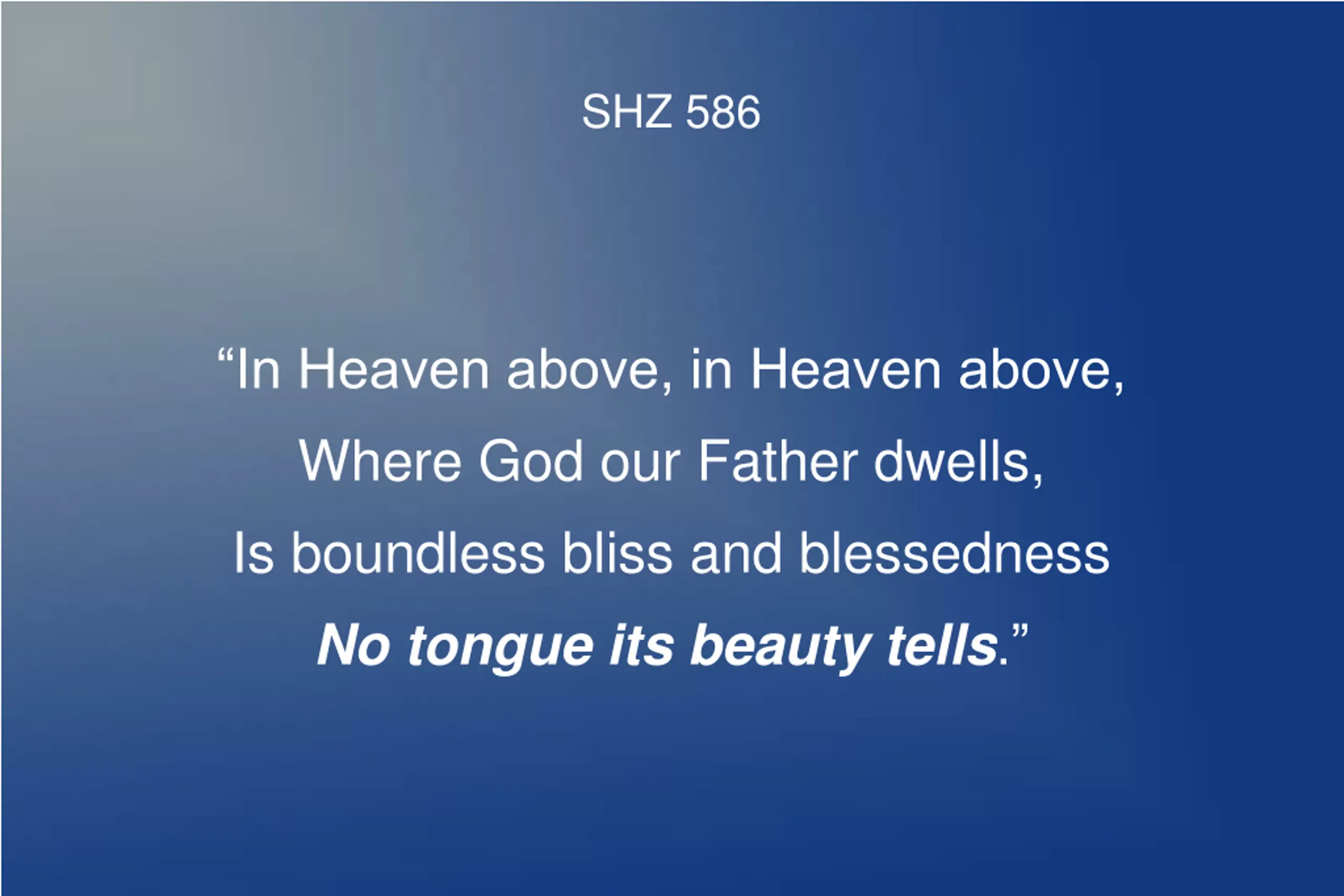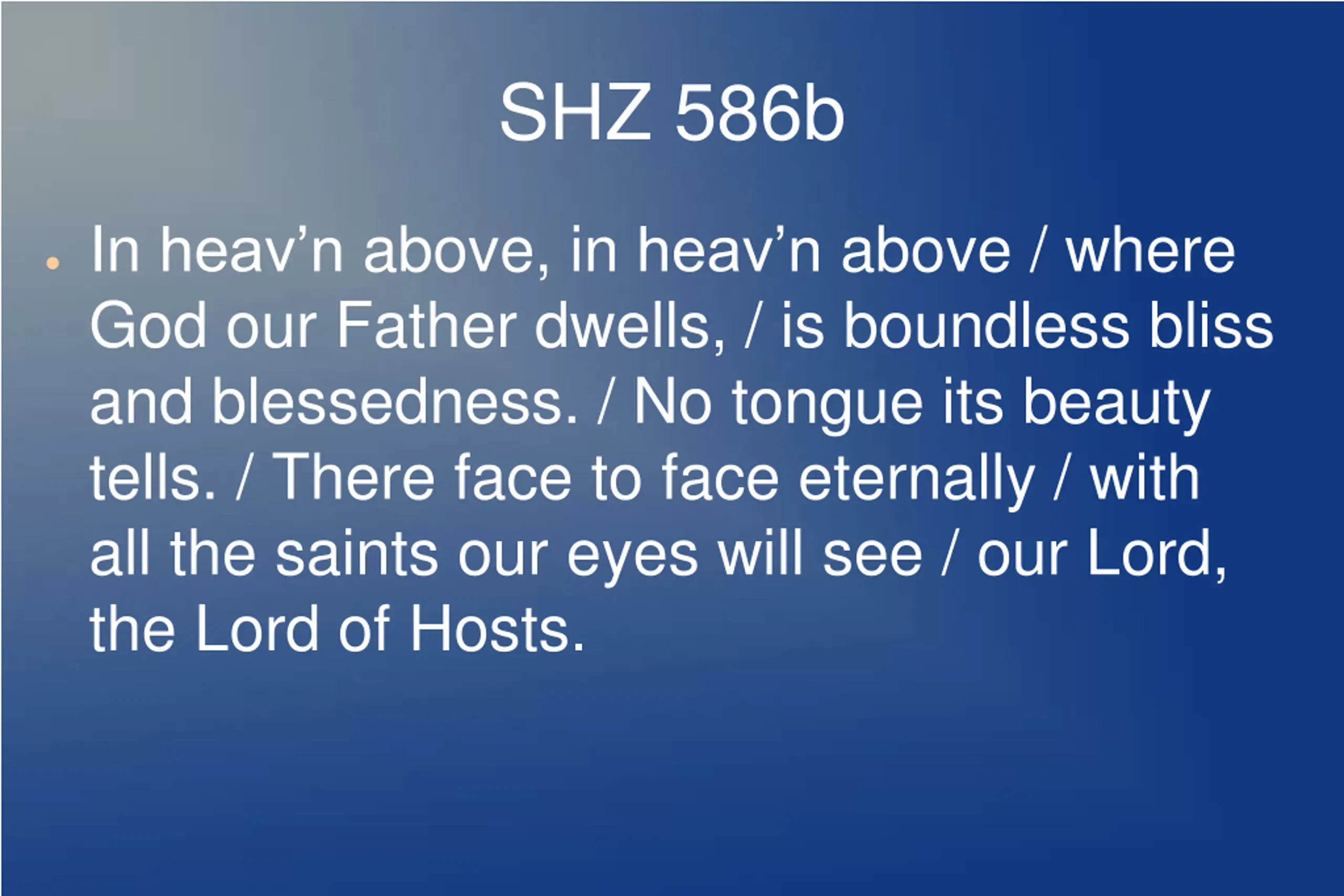 SHZ 586b In heav n above, in heav n above / where God our Father dwells, / is boundless bliss and blessedness. / No tongue its beauty tells. / There face to face eternally / with all the saints our eyes will see / our Lord, the Lord of Hosts.