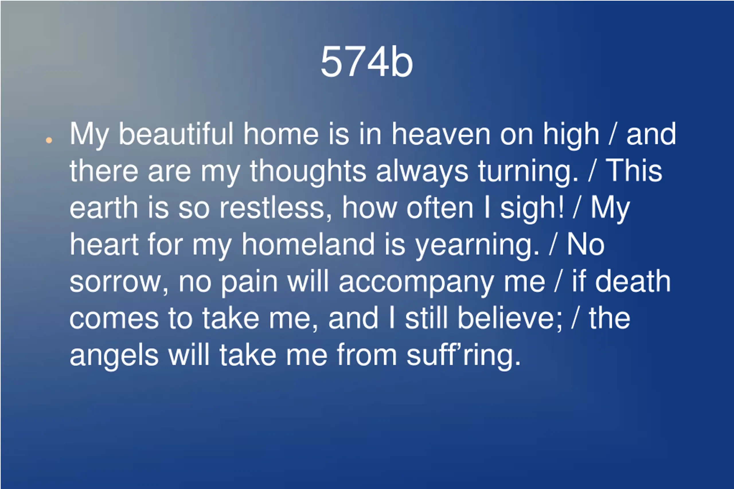 574b My beautiful home is in heaven on high / and there are my thoughts always turning. / This earth is so restless, how often I sigh! / My heart for my homeland is yearning. / No sorrow, no pain will accompany me / if death comes to take me, and I still believe; / the angels will take me from suff ring.