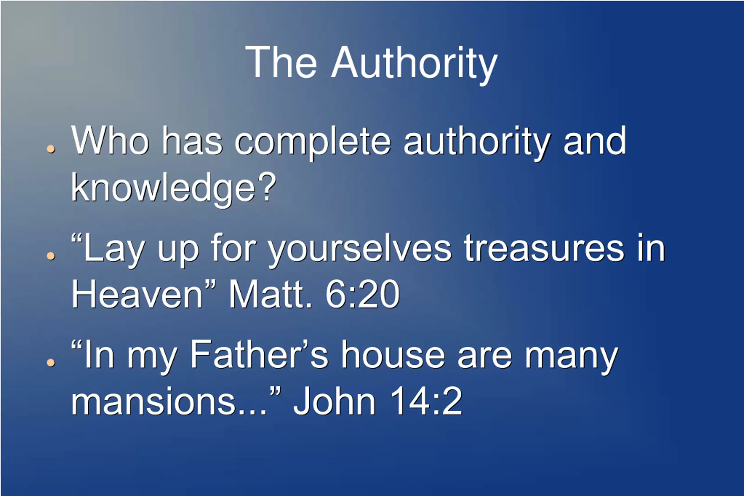 The Authority Who has complete authority and knowledge? Lay up for yourselves treasures in Heaven Matt. 6:20 In my Father s house are many mansions... John 14:2