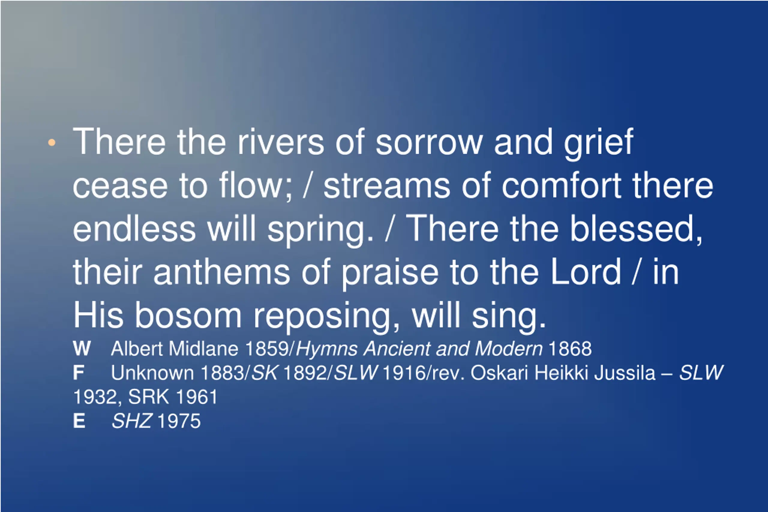 There the rivers of sorrow and grief cease to flow; / streams of comfort there endless will spring. / There the blessed, their anthems of praise to the Lord / in His bosom reposing, will sing. W Albert Midlane 1859/Hymns Ancient and Modern 1868 F Unknown 1883/SK 1892/SLW 1916/rev. Oskari Heikki Jussila SLW 1932, SRK 1961 E SHZ 1975