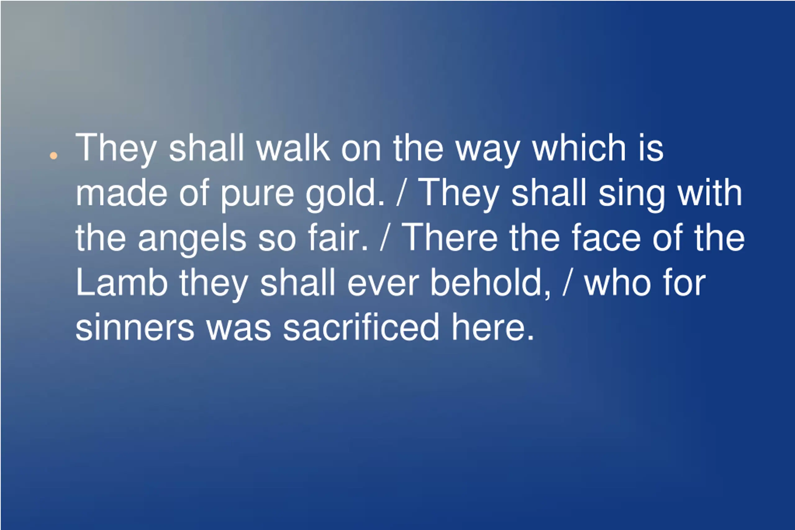 They shall walk on the way which is made of pure gold. / They shall sing with the angels so fair. / There the face of the Lamb they shall ever behold, / who for sinners was sacrificed here.