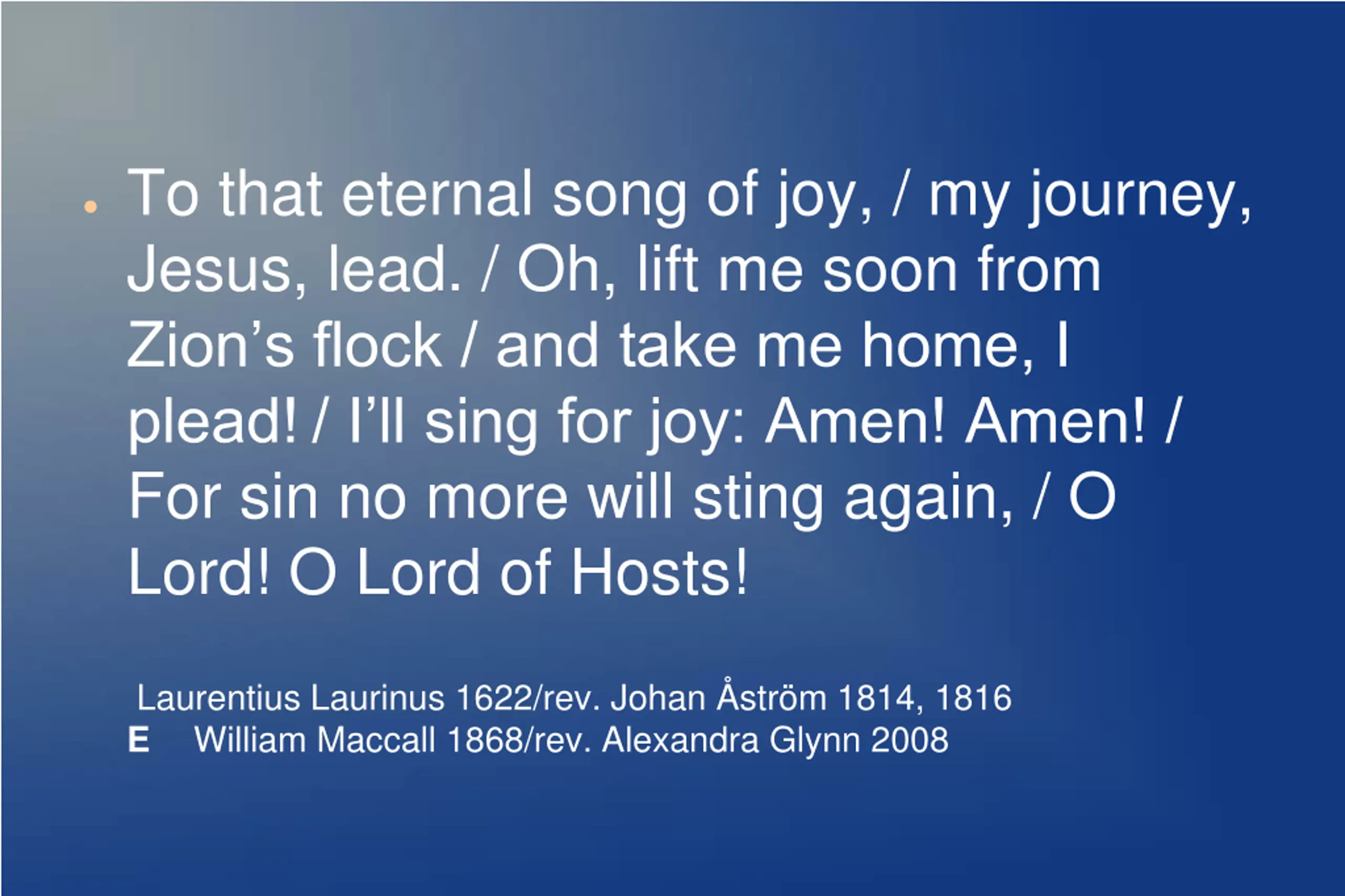 To that eternal song of joy, / my journey, Jesus, lead. / Oh, lift me soon from Zion s flock / and take me home, I plead! / I ll sing for joy: Amen! Amen! / For sin no more will sting again, / O Lord! O Lord of Hosts! Laurentius Laurinus 1622/rev. Johan str m 1814, 1816 E William Maccall 1868/rev. Alexandra Glynn 2008