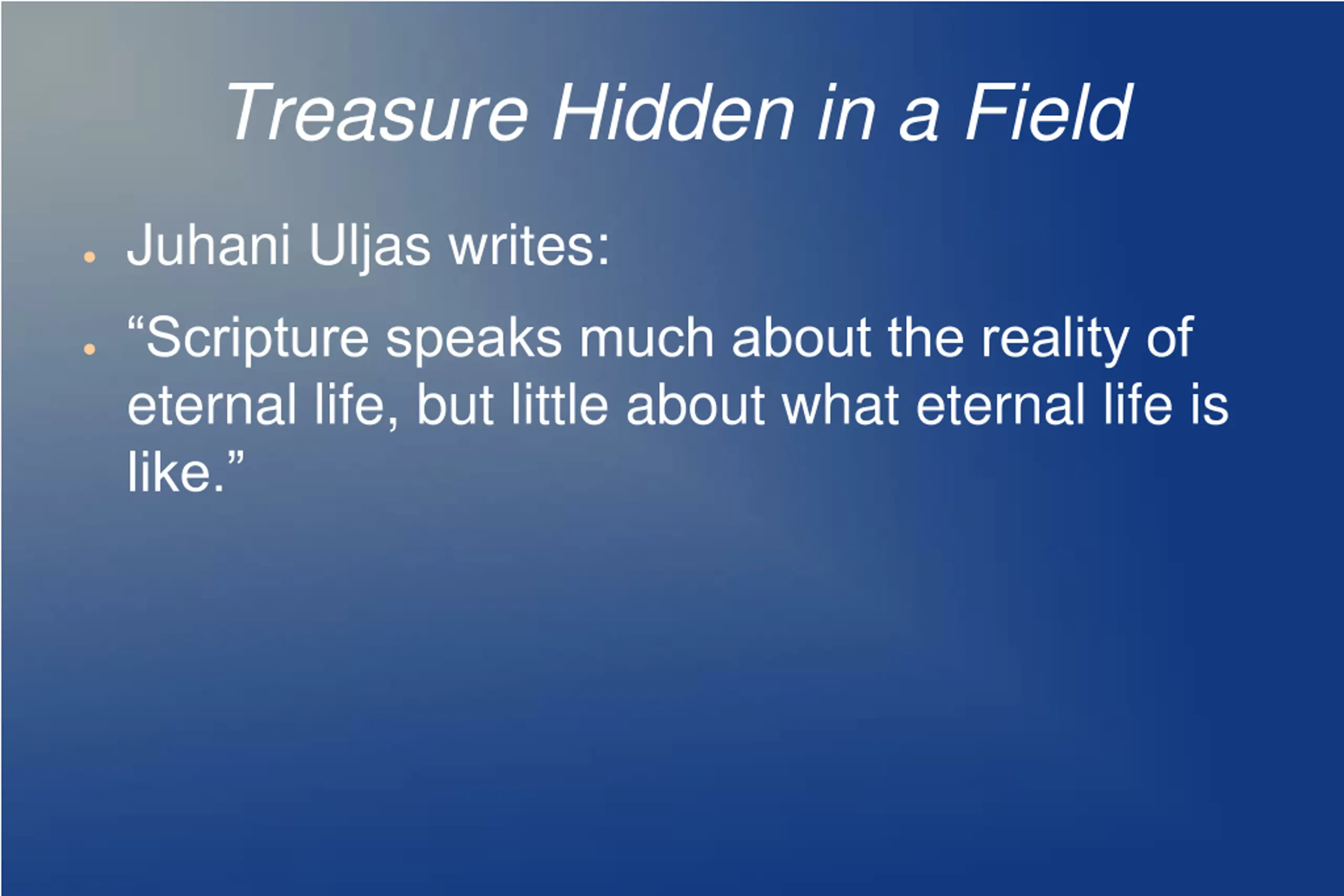Treasure Hidden in a Field Juhani Uljas writes: Scripture speaks much about the reality of eternal life, but little about what eternal life is like.