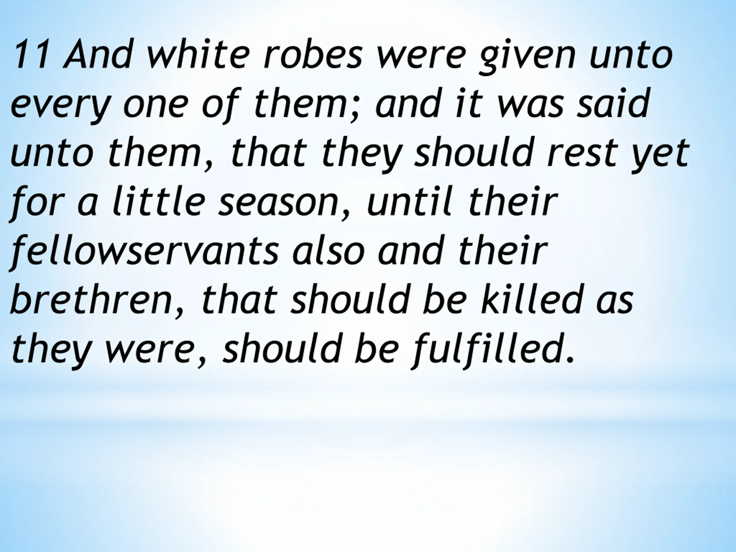 11 And white robes were given unto every one of them; and it was said unto them, that they should rest yet for a little season, until their fellowservants also and their brethren, that should be killed as they were, should be fulfilled.