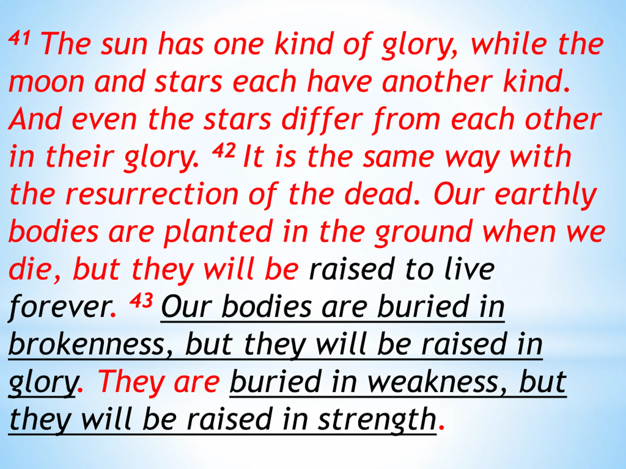 41The sun has one kind of glory, while the moon and stars each have another kind. And even the stars differ from each other in their glory. 42It is the same way with the resurrection of the dead. Our earthly bodies are planted in the ground when we die, but they will be raised to live forever.43Our bodies are buried in brokenness, but they will be raised in glory. They are buried in weakness, but they will be raised in strength.