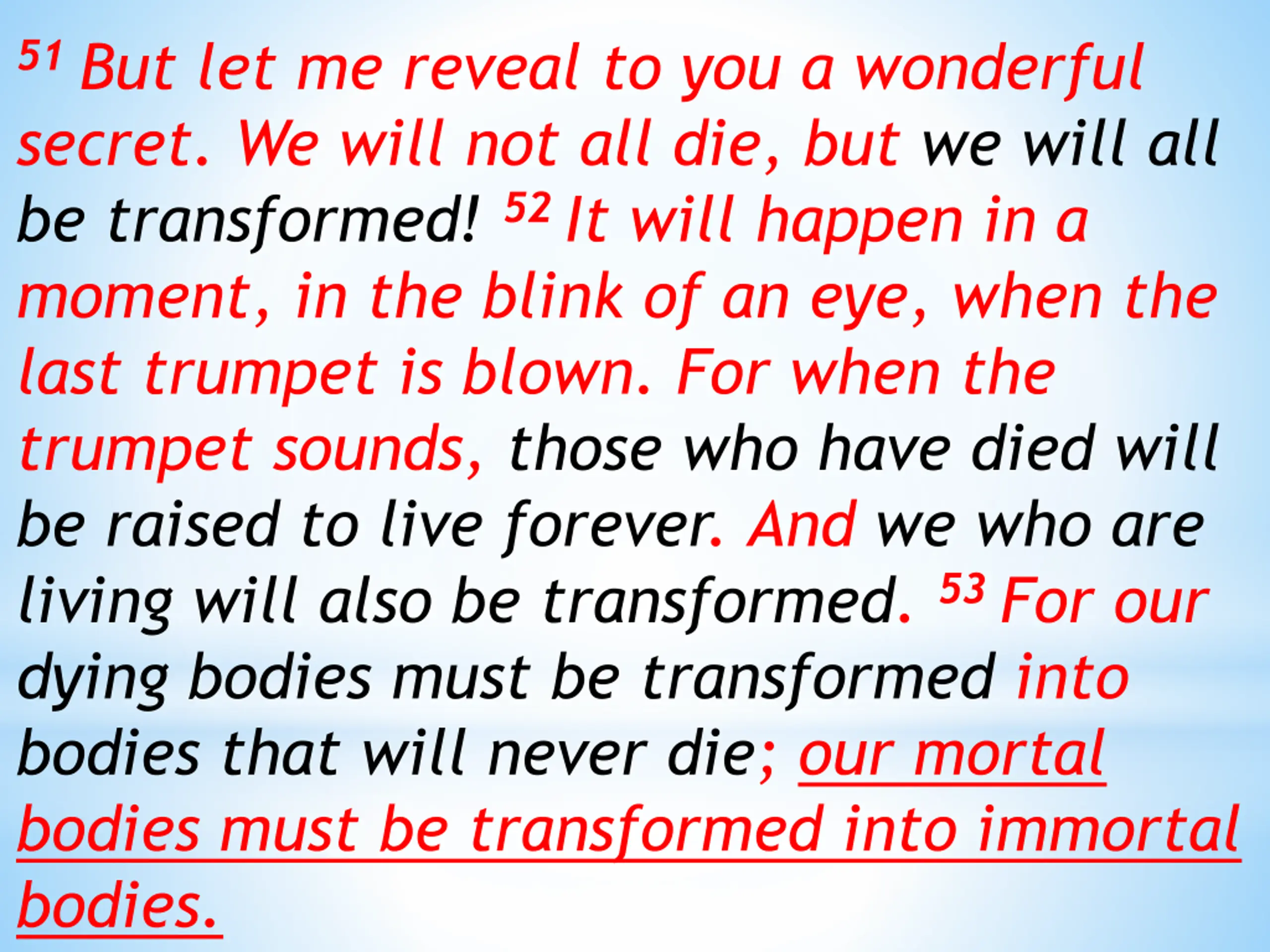 51But let me reveal to you a wonderful secret. We will not all die, but we will all be transformed!52It will happen in a moment, in the blink of an eye, when the last trumpet is blown. For when the trumpet sounds, those who have died will be raised to live forever. And we who are living will also be transformed.53For our dying bodies must be transformed into bodies that will never die; our mortal bodies must be transformed into immortal bodies.