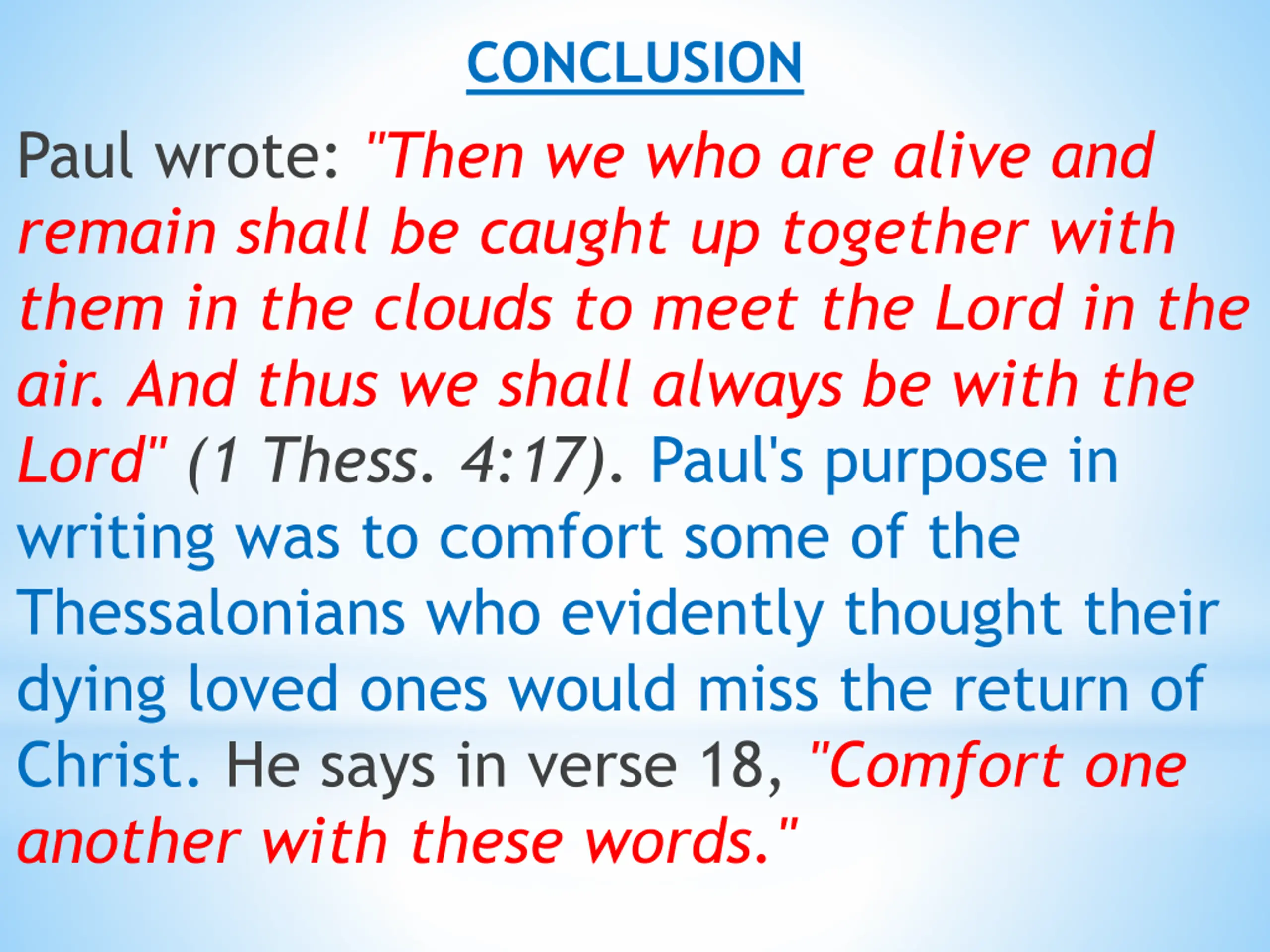 CONCLUSION Paul wrote: "Then we who are alive and remain shall be caught up together with them in the clouds to meet the Lord in the air. And thus we shall always be with the Lord" (1 Thess. 4:17). Paul's purpose in writing was to comfort some of the Thessalonians who evidently thought their dying loved ones would miss the return of Christ. He says in verse 18, "Comfort one another with these words."