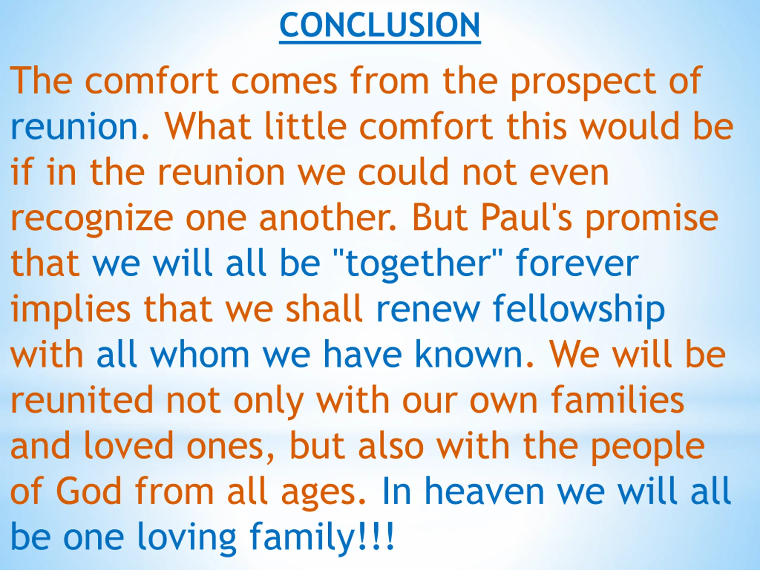 CONCLUSION The comfort comes from the prospect of reunion. What little comfort this would be if in the reunion we could not even recognize one another. But Paul's promise that we will all be "together" forever implies that we shall renew fellowship with all whom we have known. We will be reunited not only with our own families and loved ones, but also with the people of God from all ages. In heaven we will all be one loving family!!!