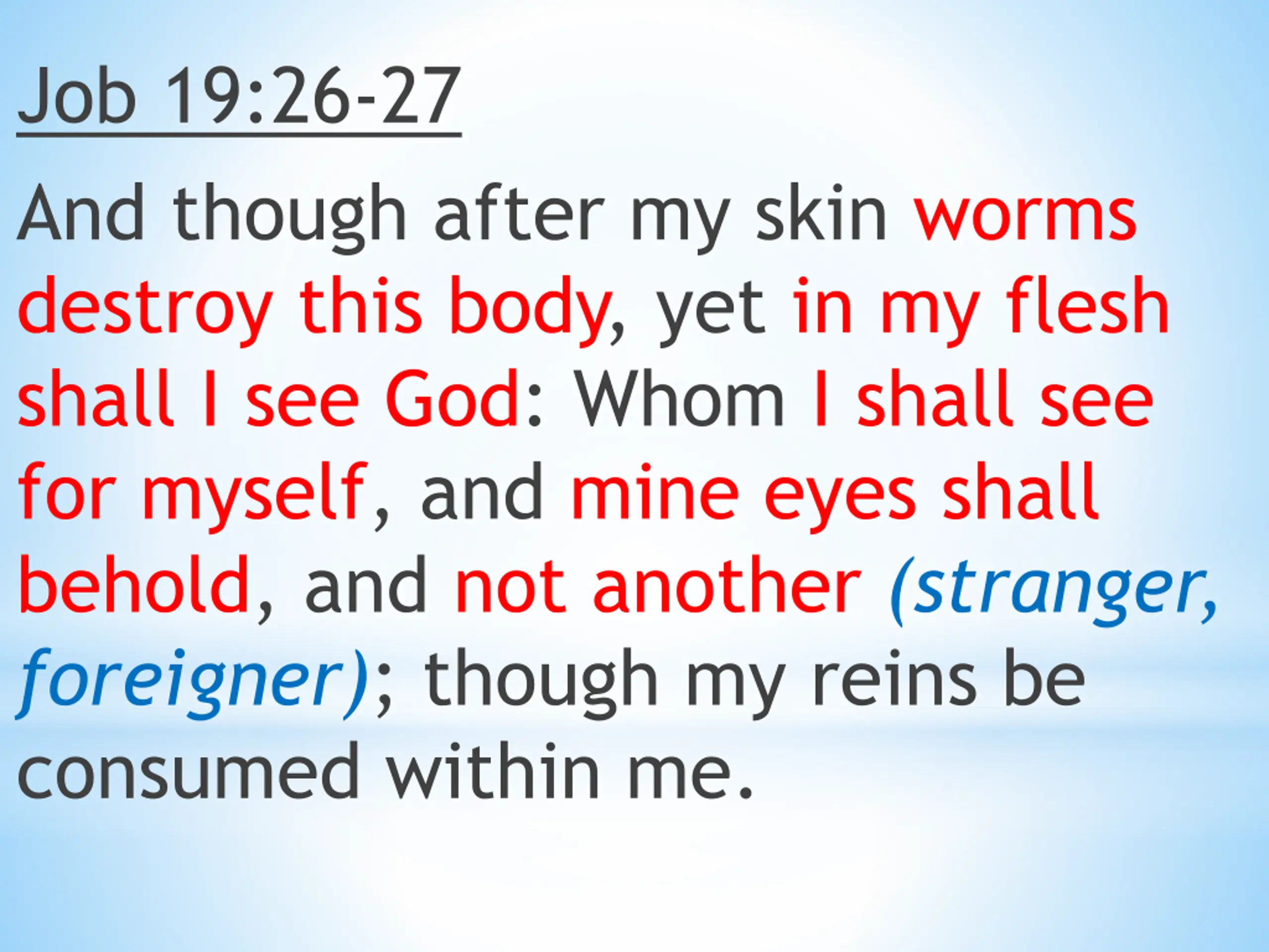 Job 19:26-27 And though after my skin worms destroy this body, yet in my flesh shall I see God: Whom I shall see for myself, and mine eyes shall behold, and not another (stranger, foreigner); though my reins be consumed within me.