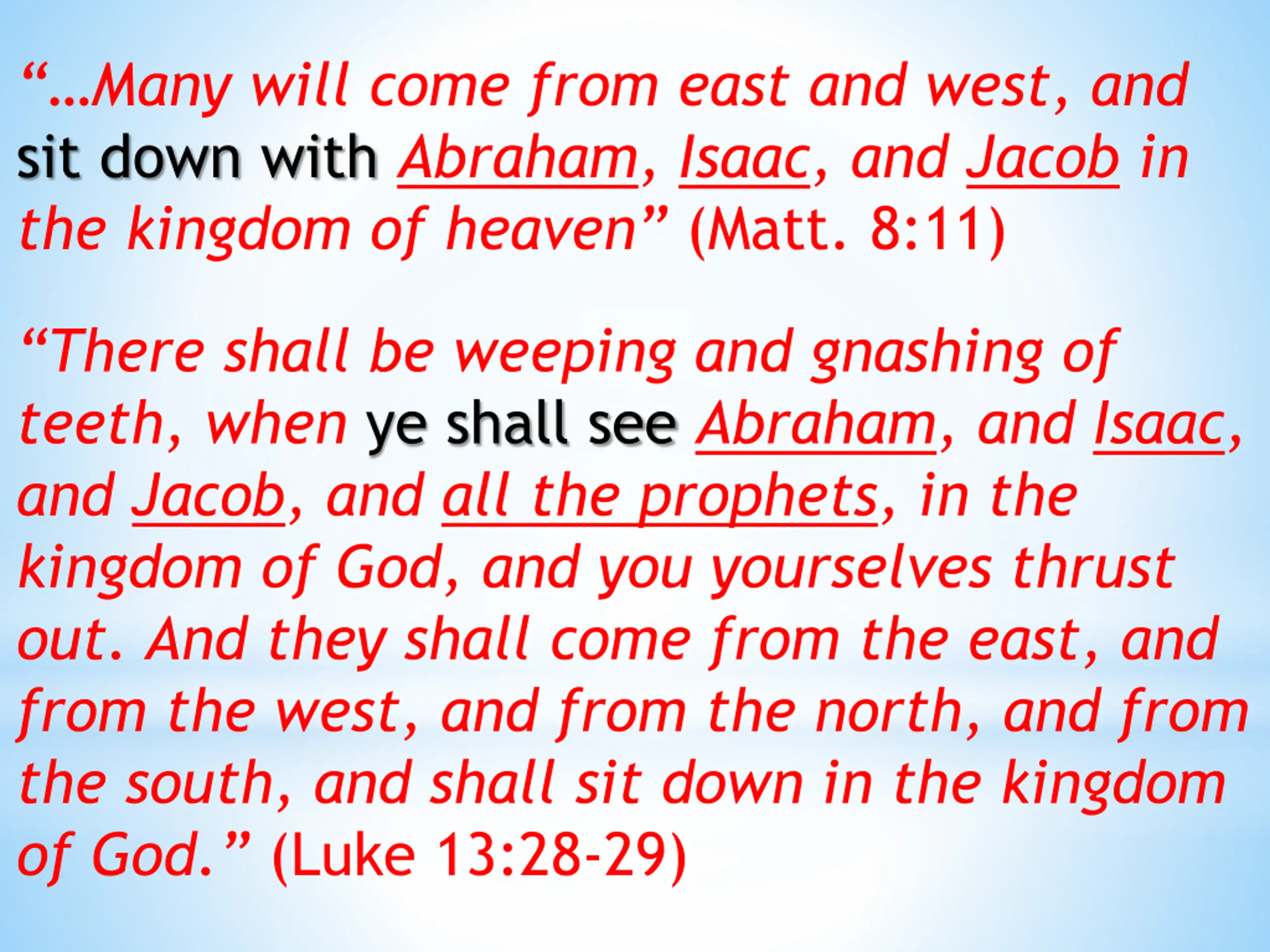 Many will come from east and west, and sit down with Abraham, Isaac, and Jacob in the kingdom of heaven (Matt. 8:11) There shall be weeping and gnashing of teeth, when ye shall see Abraham, and Isaac, and Jacob, and all the prophets, in the kingdom of God, and you yourselves thrust out. And they shall come from the east, and from the west, and from the north, and from the south, and shall sit down in the kingdom of God. (Luke 13:28-29)