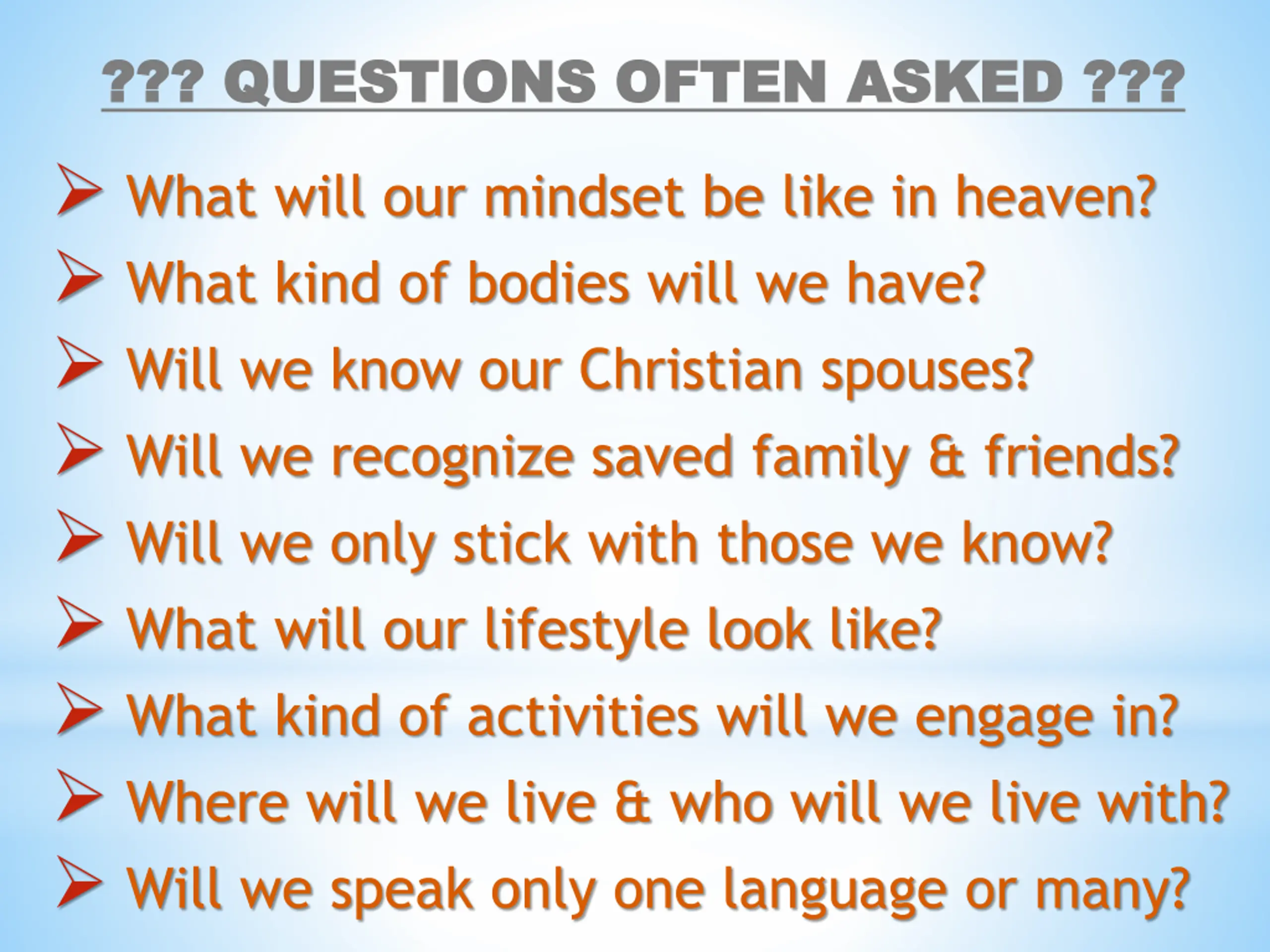 ??? QUESTIONS OFTEN ASKED ??? ??? QUESTIONS OFTEN ASKED ??? What will our mindset be like in heaven? What kind of bodies will we have? Will we know our Christian spouses? Will we recognize saved family & friends? Will we only stick with those we know? What will our lifestyle look like? What kind of activities will we engage in? Where will we live & who will we live with? Will we speak only one language or many?