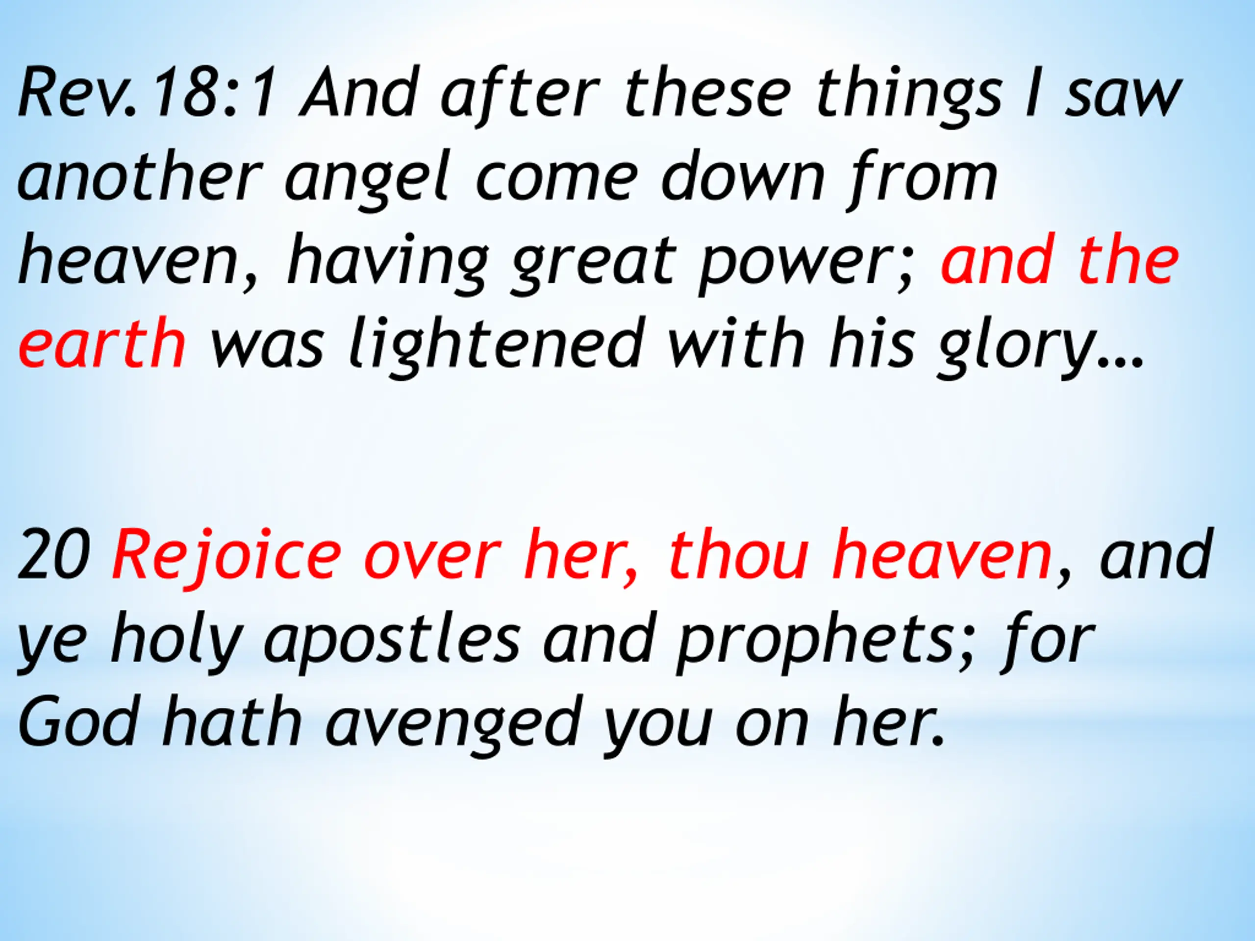 Rev.18:1 And after these things I saw another angel come down from heaven, having great power; and the earth was lightened with his glory 20 Rejoice over her, thou heaven, and ye holy apostles and prophets; for God hath avenged you on her.
