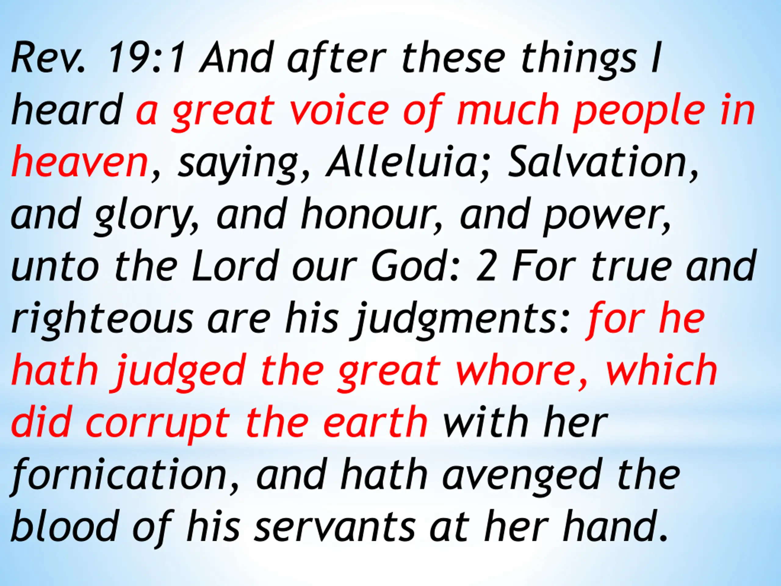 Rev. 19:1 And after these things I heard a great voice of much people in heaven, saying, Alleluia; Salvation, and glory, and honour, and power, unto the Lord our God: 2 For true and righteous are his judgments: for he hath judged the great whore, which did corrupt the earth with her fornication, and hath avenged the blood of his servants at her hand.