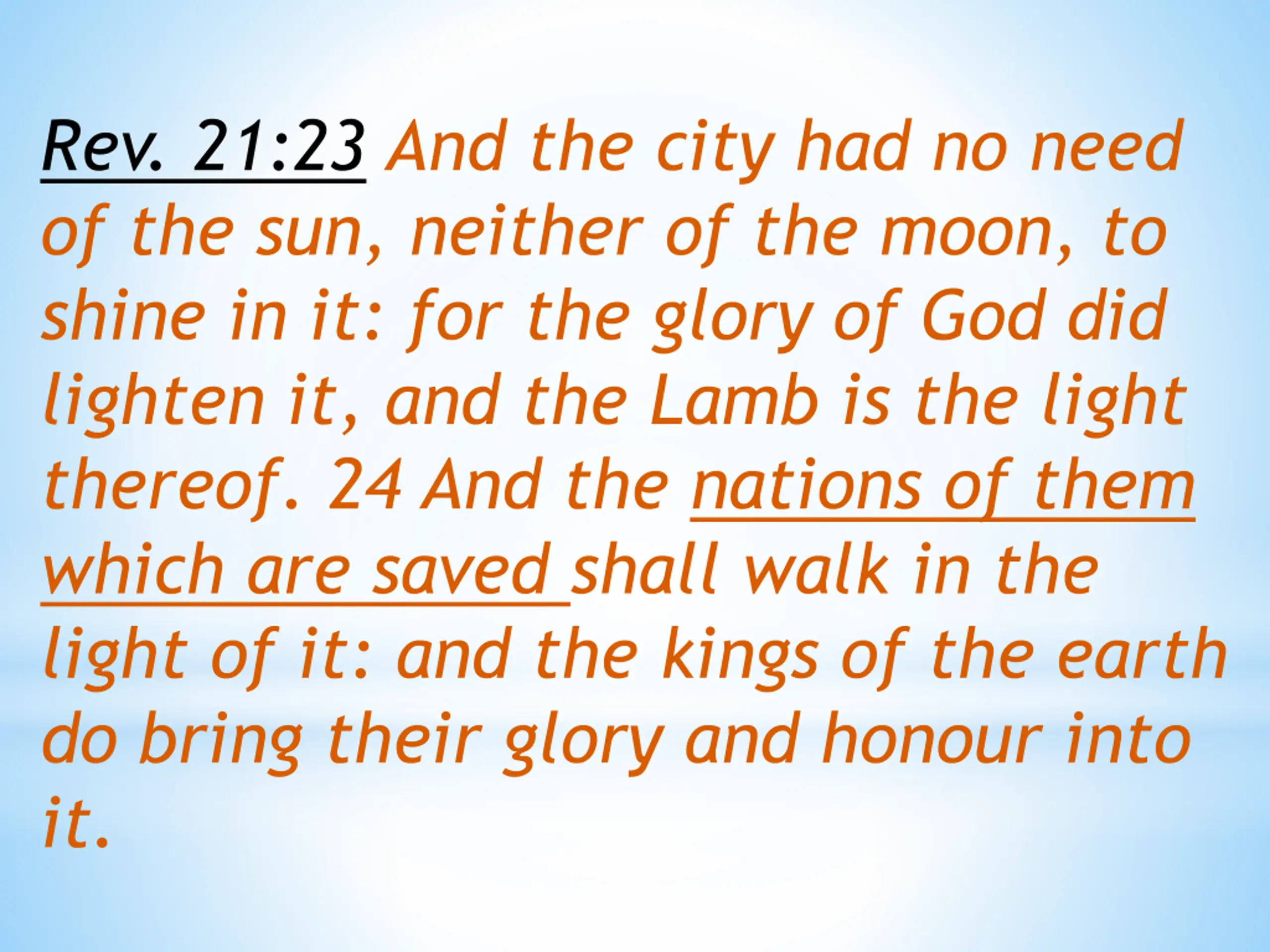 Rev. 21:23 And the city had no need of the sun, neither of the moon, to shine in it: for the glory of God did lighten it, and the Lamb is the light thereof. 24 And the nations of them which are saved shall walk in the light of it: and the kings of the earth do bring their glory and honour into it.