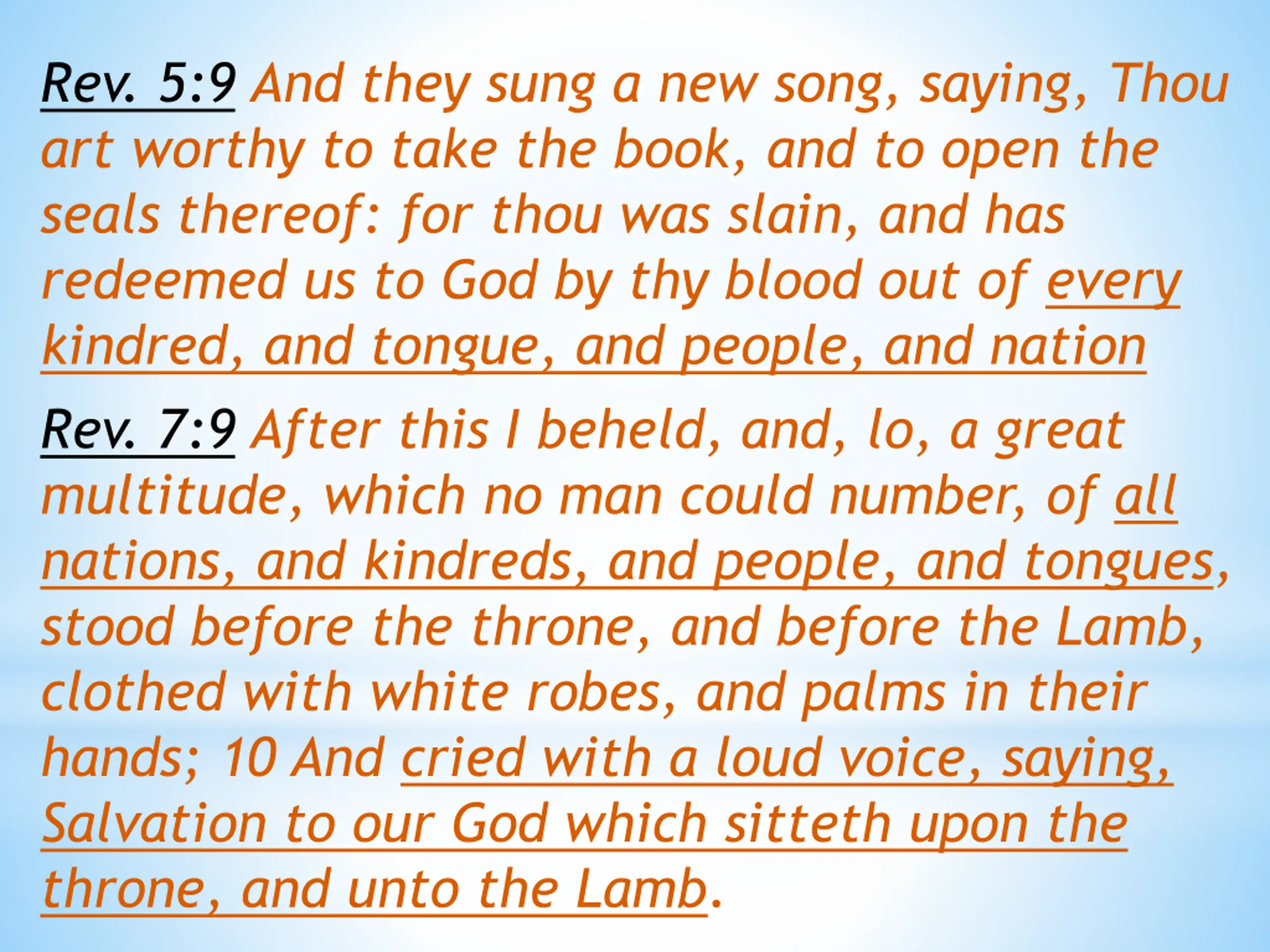 Rev. 5:9 And they sung a new song, saying, Thou art worthy to take the book, and to open the seals thereof: for thou was slain, and has redeemed us to God by thy blood out of every kindred, and tongue, and people, and nation Rev. 7:9 After this I beheld, and, lo, a great multitude, which no man could number, of all nations, and kindreds, and people, and tongues, stood before the throne, and before the Lamb, clothed with white robes, and palms in their hands; 10 And cried with a loud voice, saying, Salvation to our God which sitteth upon the throne, and unto the Lamb.