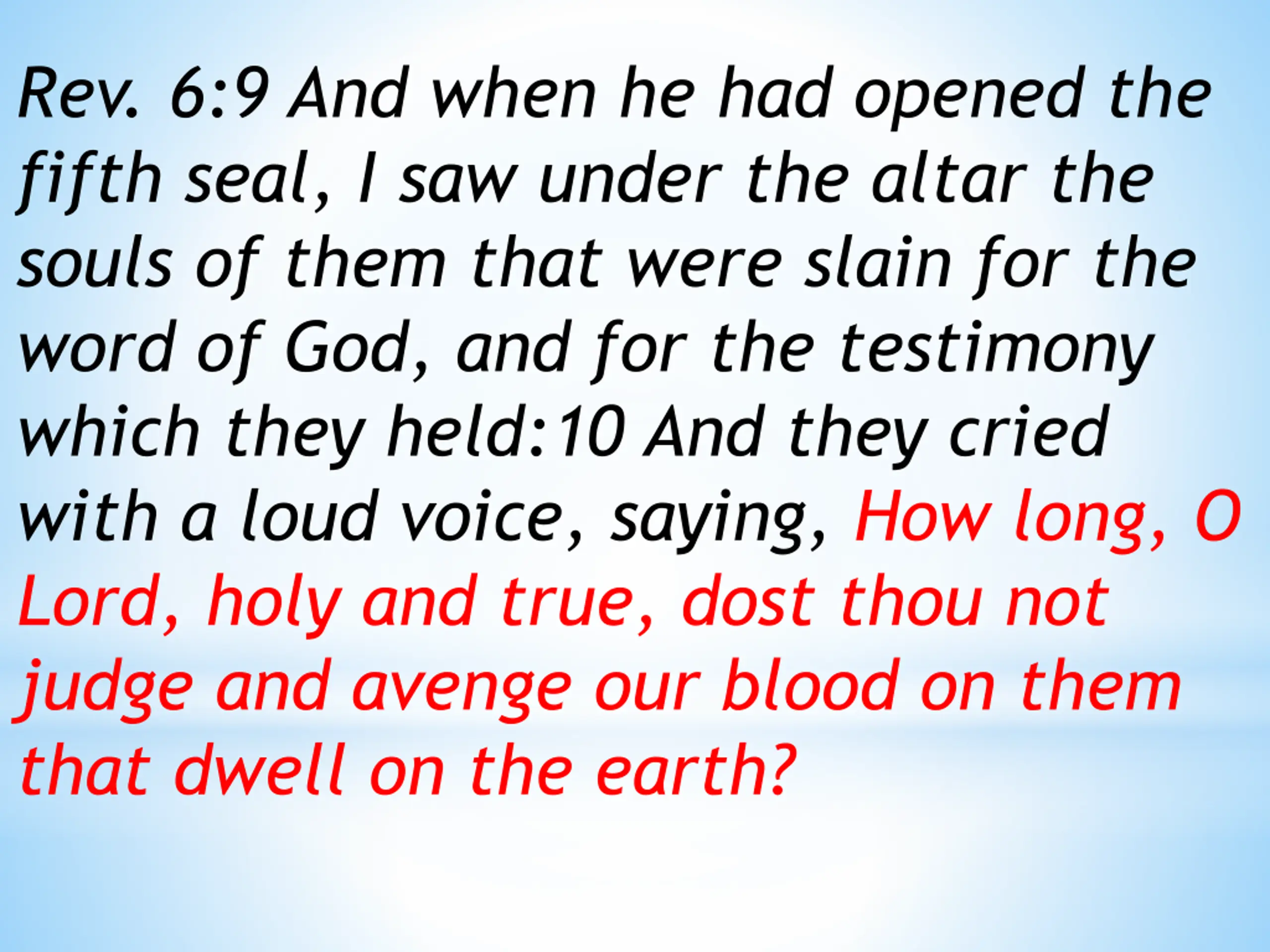 Rev. 6:9 And when he had opened the fifth seal, I saw under the altar the souls of them that were slain for the word of God, and for the testimony which they held:10 And they cried with a loud voice, saying, How long, O Lord, holy and true, dost thou not judge and avenge our blood on them that dwell on the earth?