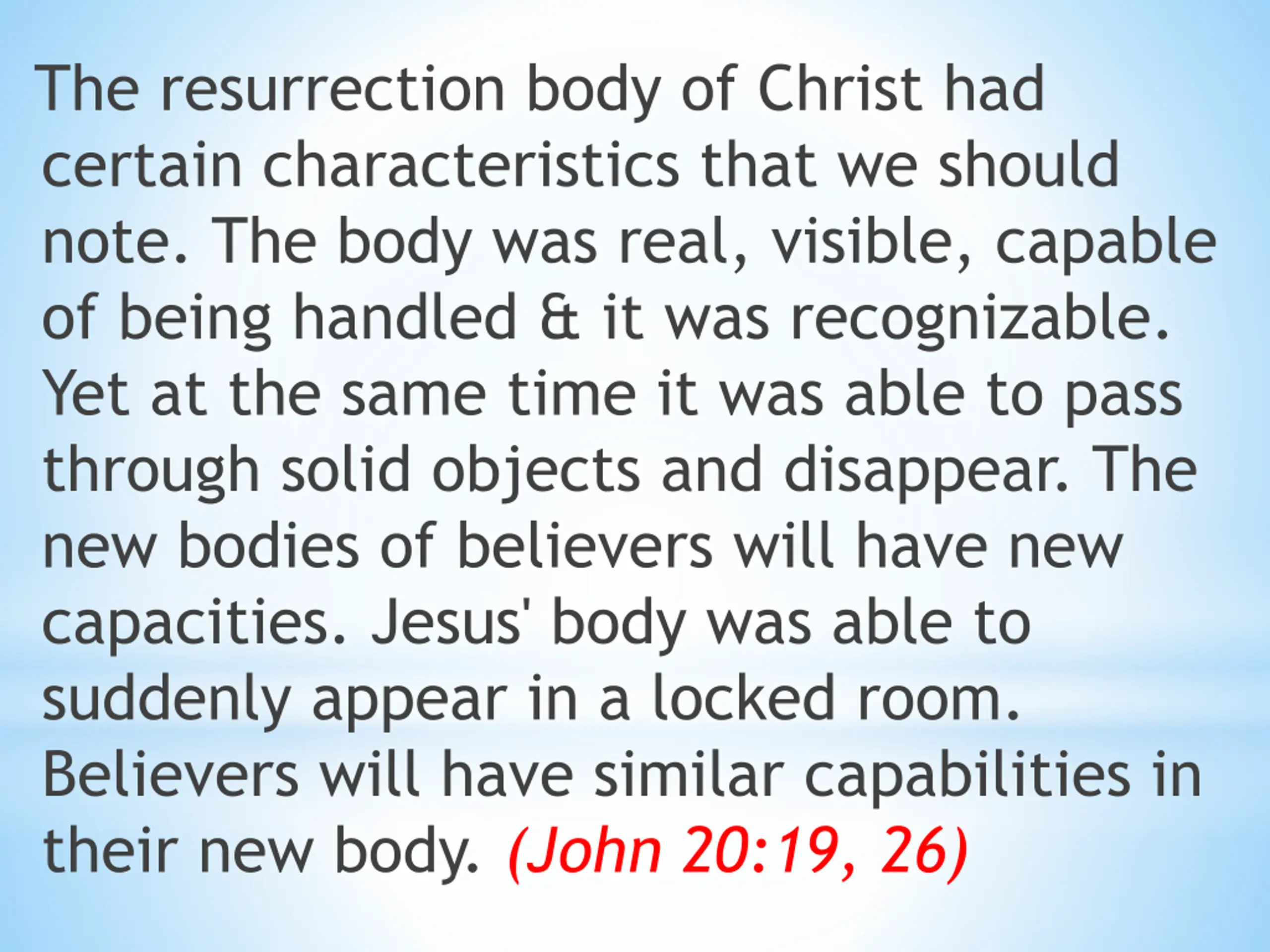 The resurrection body of Christ had certain characteristics that we should note. The body was real, visible, capable of being handled & it was recognizable. Yet at the same time it was able to pass through solid objects and disappear. The new bodies of believers will have new capacities. Jesus' body was able to suddenly appear in a locked room. Believers will have similar capabilities in their new body. (John 20:19, 26)