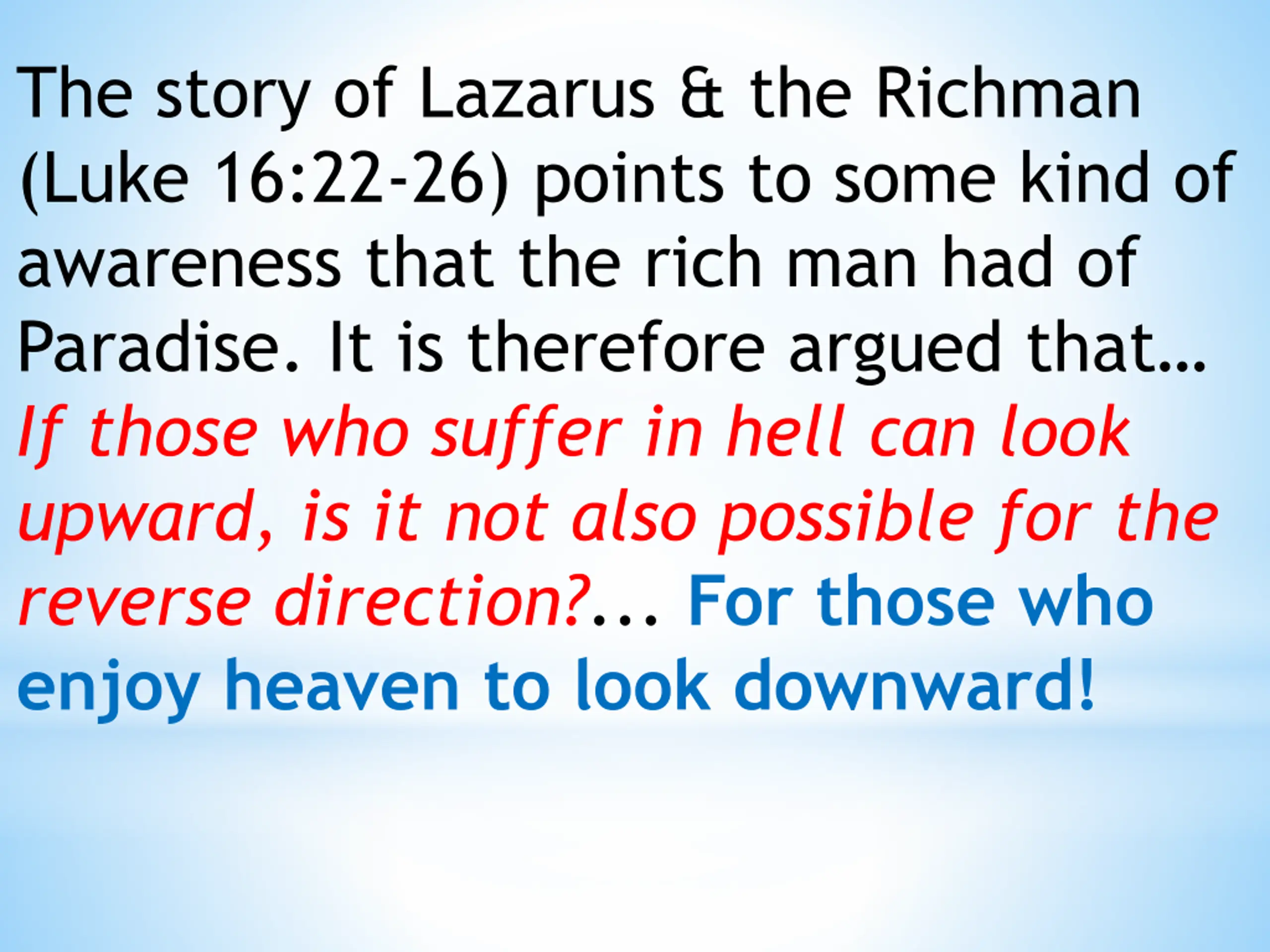 The story of Lazarus & the Richman (Luke 16:22-26) points to some kind of awareness that the rich man had of Paradise. It is therefore argued that If those who suffer in hell can look upward, is it not also possible for the reverse direction?... For those who enjoy heaven to look downward!