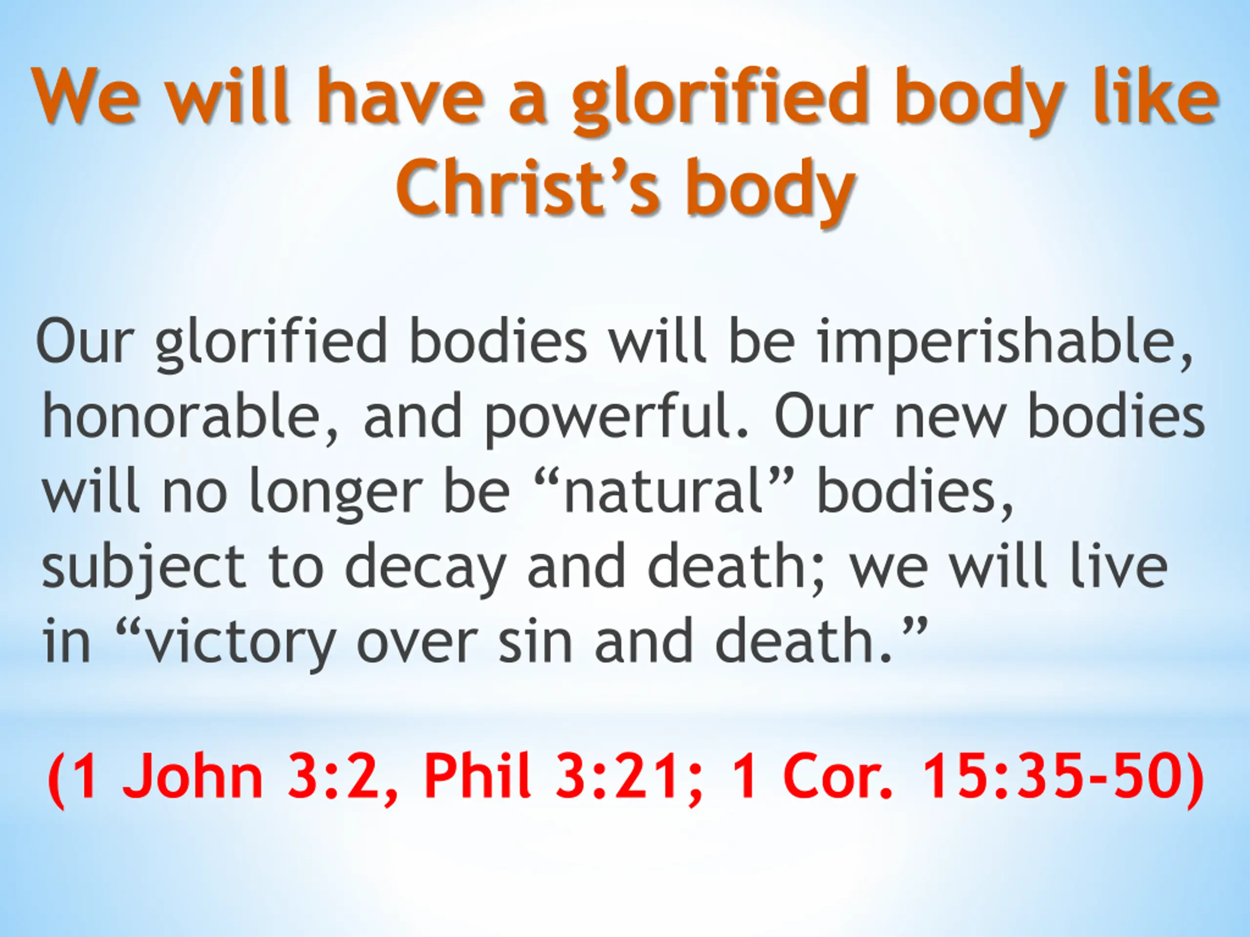 We will have a glorified body like Christ s body Our glorified bodies will be imperishable, honorable, and powerful. Our new bodies will no longer be natural bodies, subject to decay and death; we will live in victory over sin and death. (1 John 3:2, Phil 3:21; 1 Cor. 15:35-50)