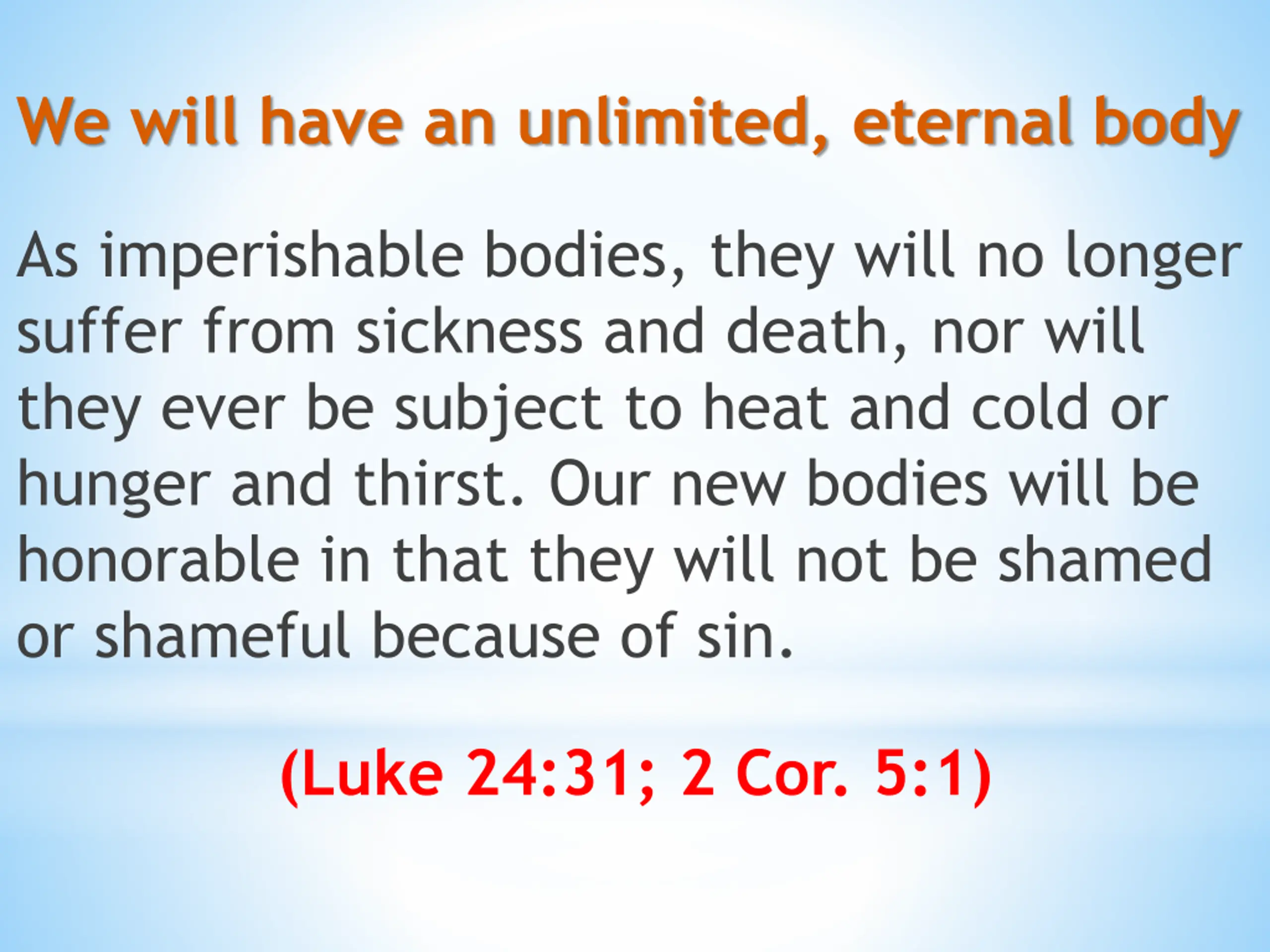 We will have an unlimited, eternal body As imperishable bodies, they will no longer suffer from sickness and death, nor will they ever be subject to heat and cold or hunger and thirst. Our new bodies will be honorable in that they will not be shamed or shameful because of sin. (Luke 24:31; 2 Cor. 5:1)