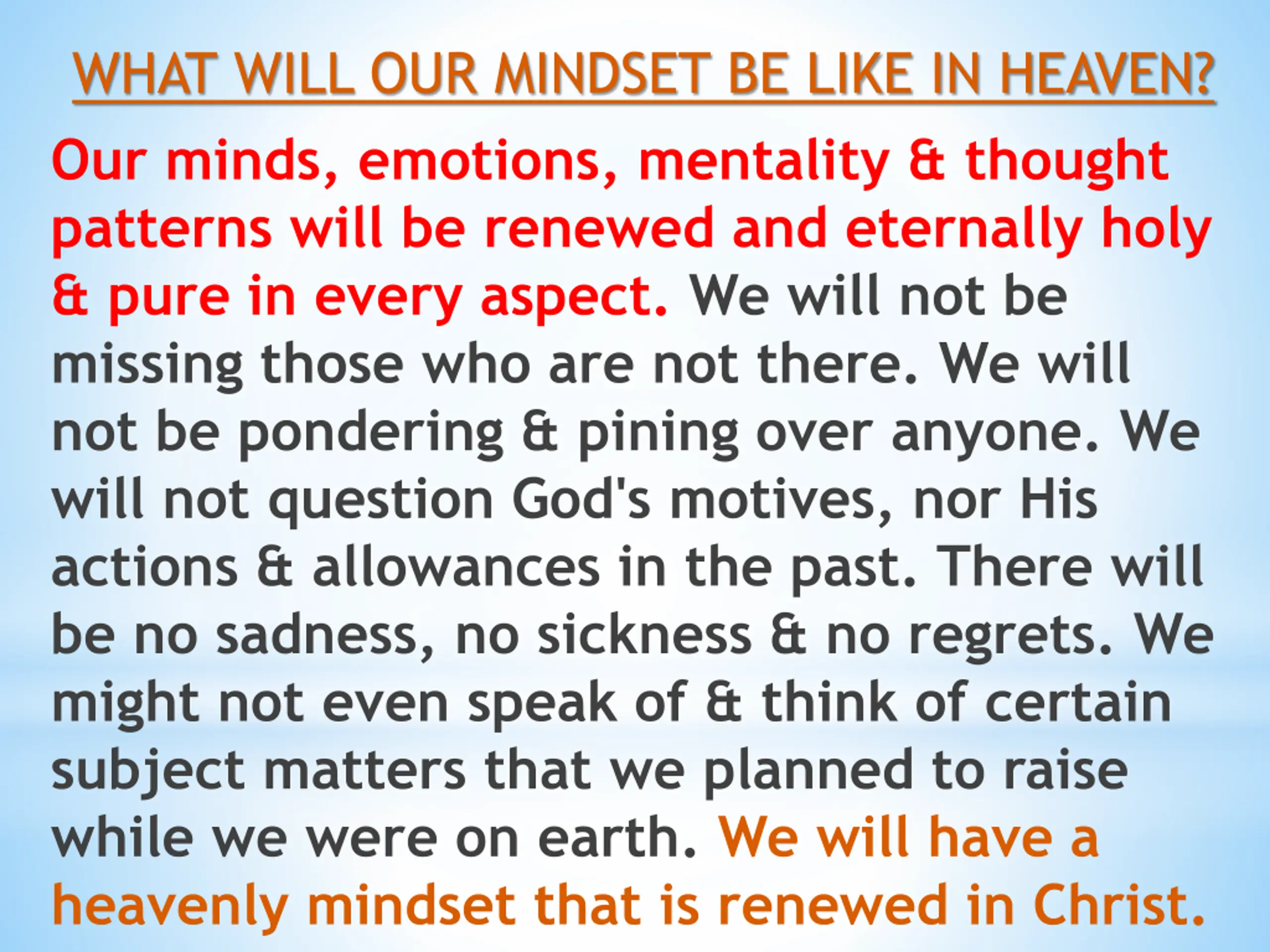 WHAT WILL OUR MINDSET BE LIKE IN HEAVEN? Our minds, emotions, mentality & thought patterns will be renewed and eternally holy & pure in every aspect. We will not be missing those who are not there. We will not be pondering & pining over anyone. We will not question God's motives, nor His actions & allowances in the past. There will be no sadness, no sickness & no regrets. We might not even speak of & think of certain subject matters that we planned to raise while we were on earth. We will have a heavenly mindset that is renewed in Christ.